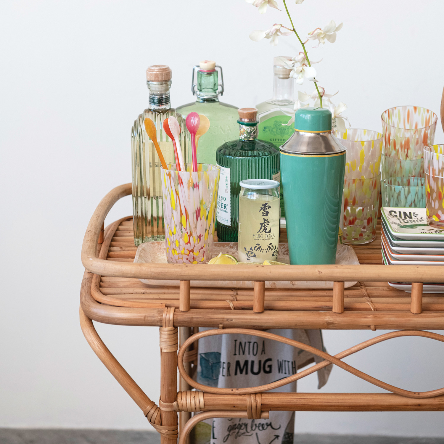This enameled stainless steel cocktail shaker with a colored edge is a functional and stylish addition to any bar. It features a round base, a lid with a strainer, and a cap for convenience. It can mix and serve cocktails, mocktails, or juices, and can be used as a decorative item or a gift. It can handle 21 oz. of drinks and can match various decor styles like cottagecore, modern, boho, Scandinavian, or glam. The enameled stainless steel is durable and resistant to rust and corrosion, making it easy to clean. This versatile and stylish item makes a perfect gift or addition to any barware collection.