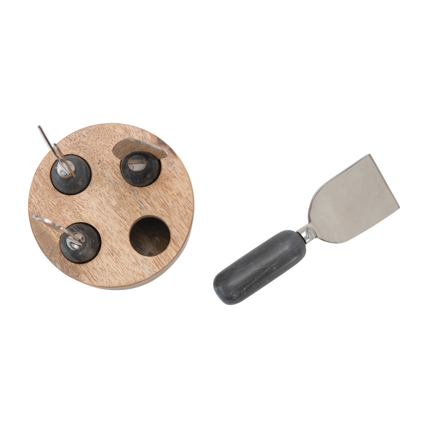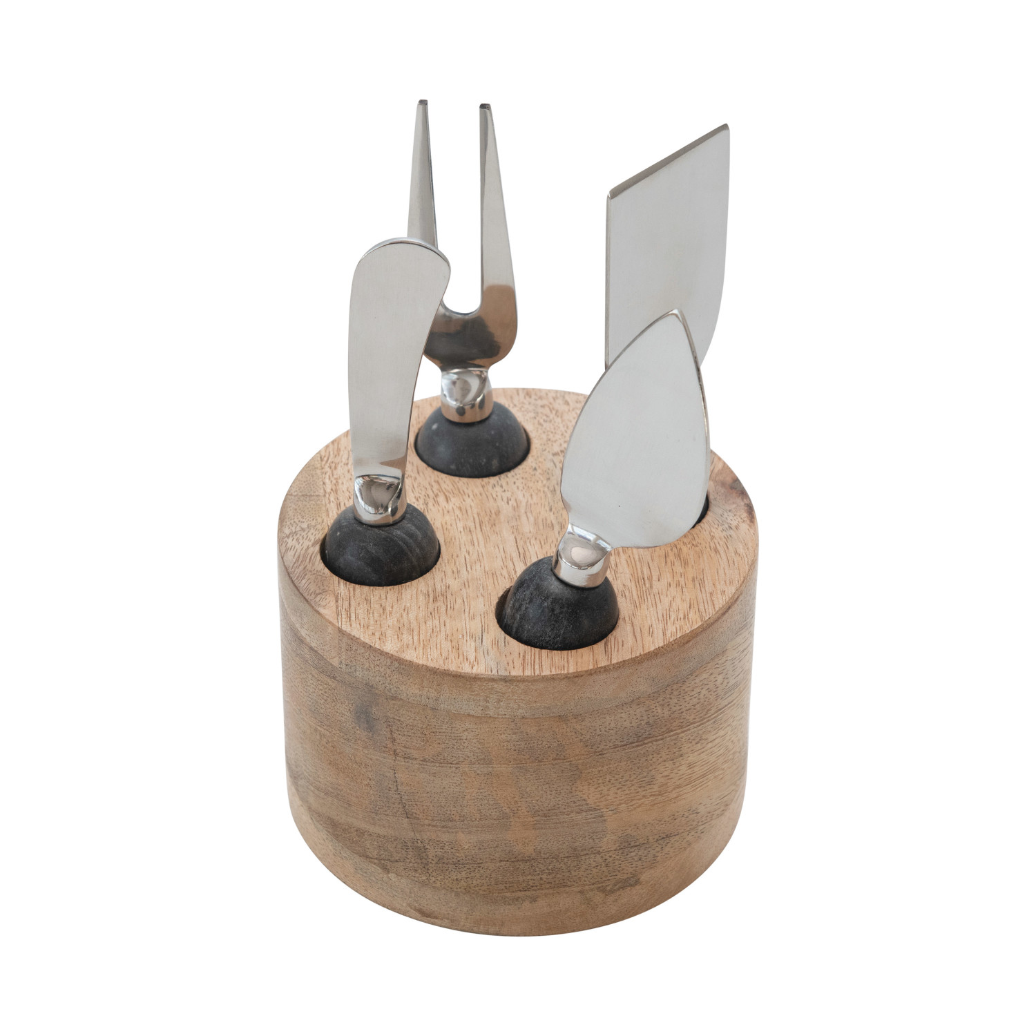 Catalog Name: 4-1/2" Round x 6-1/2"H Stainless Steel Cheese Servers w/ Marble Handles & Mango Wood Stand, Grey & Natural, Set of 5