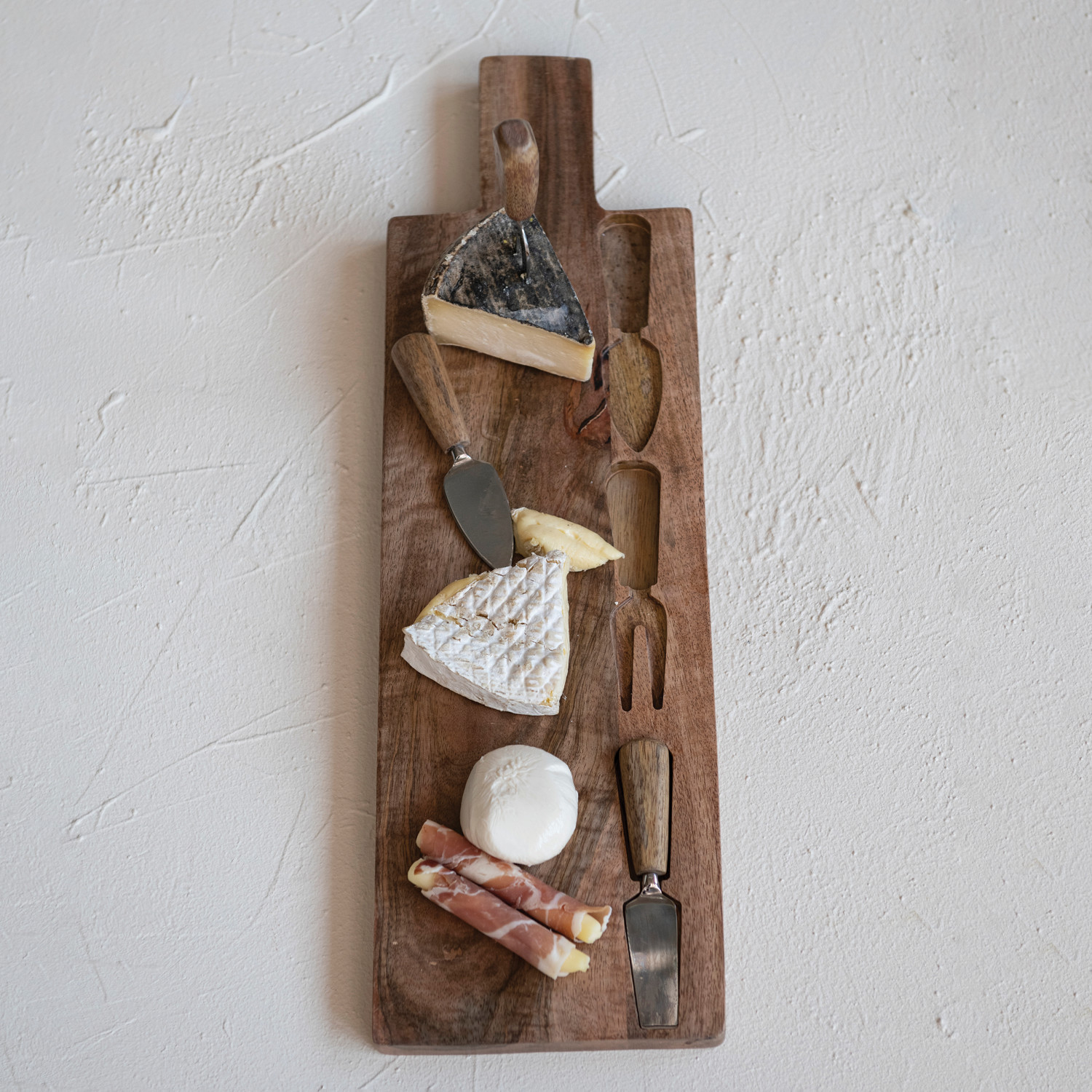 Catalog Name: 22-3/4"L x 6-3/4"W Mango Wood Cheese/Cutting Board w/ Handle & Inlaid Stainless Steel & Wood Cheese Utensils, Natural, Set of 4