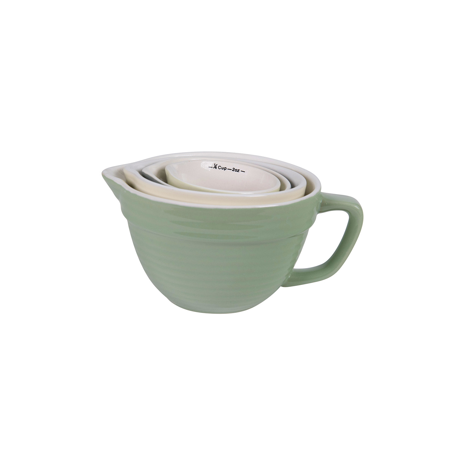 These charming measuring cups are inspired by vintage batter bowls. Perfect for your cooking needs, the inside of each of these measuring cups is marked in both ounces and cups. One side of each is designed with a V-shaped spout for easy pouring. They stack inside each other for easy storing and are dishwasher safe.