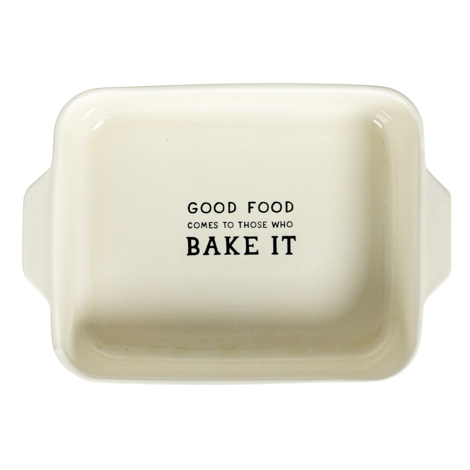 This Rectangular Stoneware Baker, measuring 10.25 inches long and 2.25 inches high, is a testament to both form and function. Its pristine white surface is adorned with the playful phrase "Good Food Comes To Those Who Bake It," making it a source of motivation in any kitchen. The baker's classic shape and robust material make it a reliable choice for all baking needs, while its simple elegance ensures it will fit seamlessly into eclectic, farmhouse, or French country decor. Whether it's used for a family meal or a gathering of friends, this stoneware baker is sure to be the centerpiece of delicious memories.