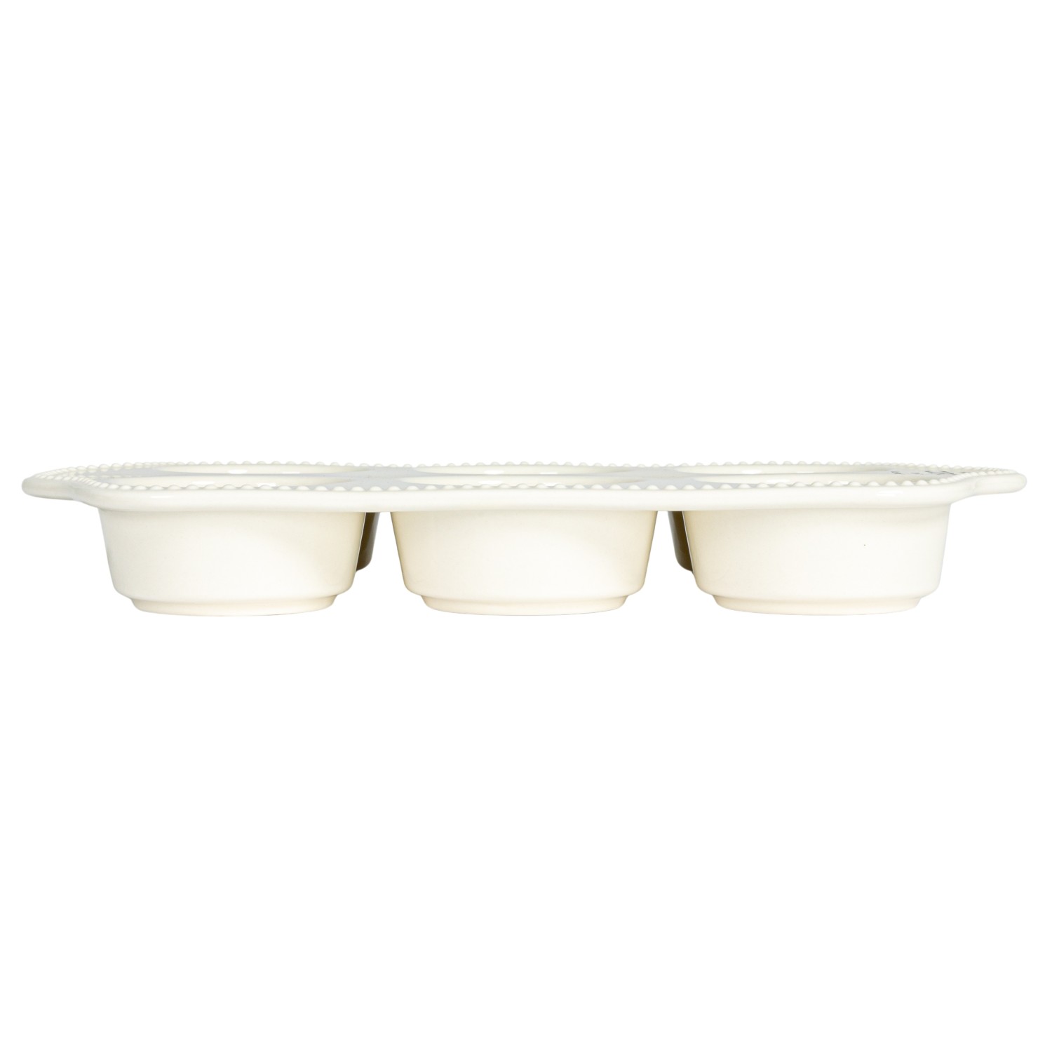 This 12-inch long, and 7-inch wide stoneware muffin pan is a baker's delight, complete with an uplifting message that reads "Happiness Is Cupcakes..." The rectangular pan, featuring six molds, is ideal for whipping up a batch of every favorite cupcake. Crafted from white stoneware, it not only bakes efficiently but also adds a touch of elegance to the kitchenware. Its charming design fits well within eclectic, farmhouse, or French country themes, inviting a warm, homemade feel to every culinary creation. Whether it's a weekend treat or a special occasion, this muffin pan is sure to spread happiness, one cupcake at a time.