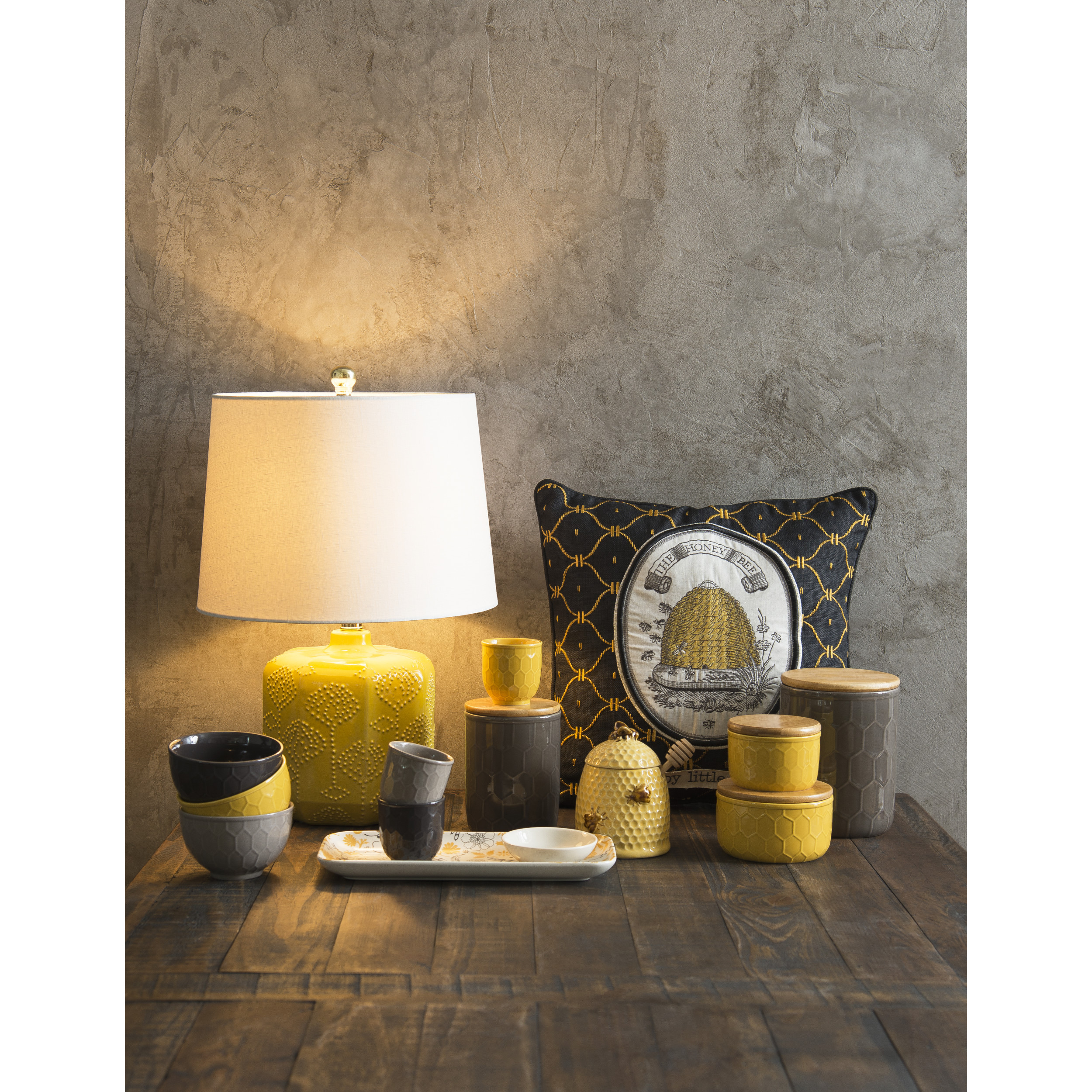 Honey should be served in this yellow stoneware container. It has a wood dipper and the lid has an opening to allow the dipper to stay inside keeping your table and counters clean. It is microwave safe making warming up the honey a breeze.