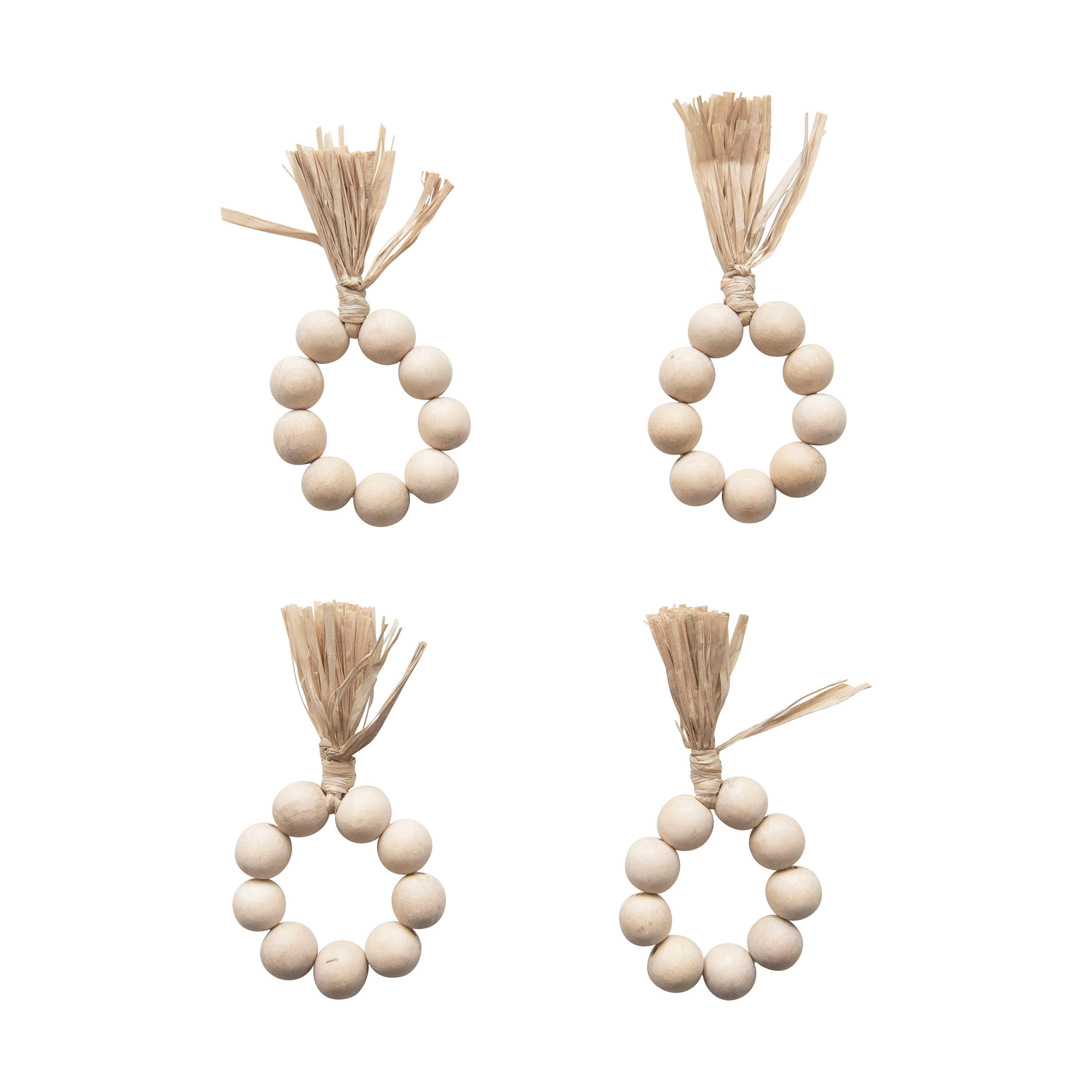 Catalog Name: 2-1/4" Round Wood Bead Napkin Rings w/ Raffia Tassel, Natural, Set of 4