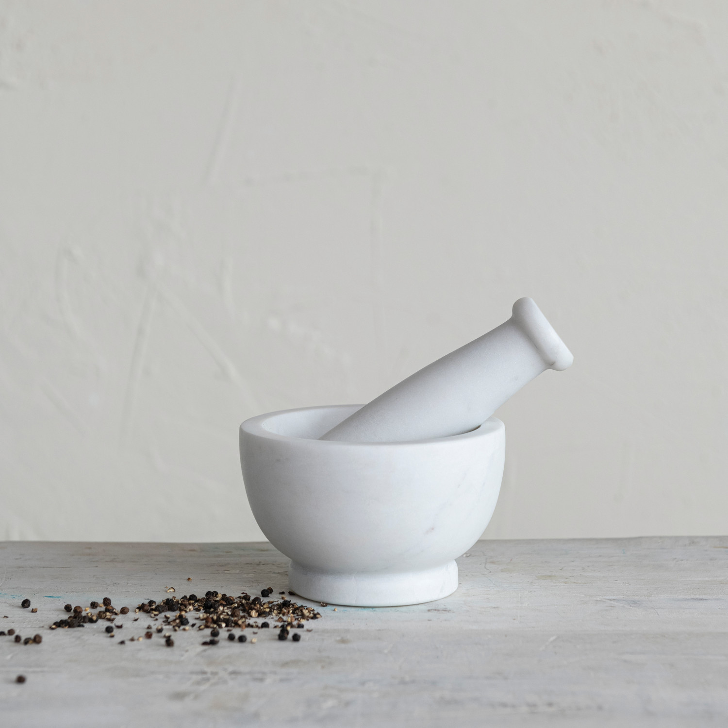 Our thoughtfully curated collection of kitchen tools showcases an expansive selection of natural materials and artisanal silhouettes that are all thoughtfully designed for the modern host or home chef. Elevate weekday dinners or special occasions with an offering of stylishly versatile pieces including rolling pins, salt and pepper shakers, pepper mills, juicers, dish brushes, mortar and pestles, and so much more. Choose from a wide array of materials from marble and wood to stoneware and bamboo, and styles from modern farmhouse and boho to mid-century modern and minimalist. Curate a dazzlingly elegant display for a dinner party, or simply add a touch of style to daily rituals with a piece that is sure to impress. This modern mortar and pestle set showcases sleek, solid marble construction in a classic silhouette. This piece is food safe. Not dishwasher safe. Made from marble.