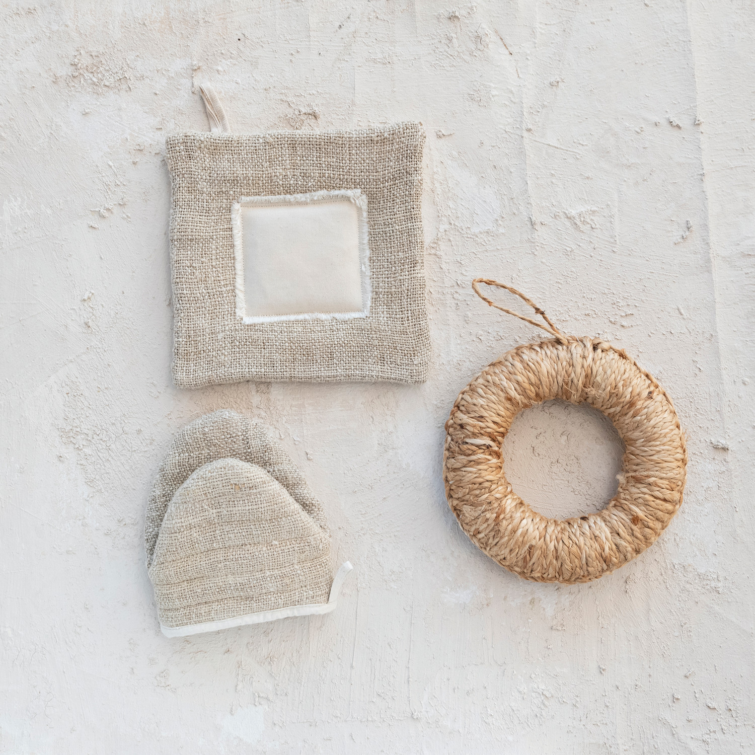 This round woven jute trivet with loop is a beautiful and practical piece to enhance the home's natural beauty. The trivet is made of woven jute, a natural fiber that is durable, eco-friendly, and biodegradable. The jute has a natural color and texture, adding warmth and character to the space. The trivet has a round shape that fits any size of pots, pans, or dishes. The trivet also has a loop for hanging, which makes it easy to store and display. Protect the table or countertop from hot pots, pans, or dishes. It can also be hung on a wall or a hook as a decorative element, adding a touch of texture and warmth to the table or kitchen. It measures 7 inches in diameter and 1.5 inches in thickness. This trivet with a loop will add a touch of nature and functionality to any farmhouse, lodge, Scandinavian, coastal, or cabin-style decor.