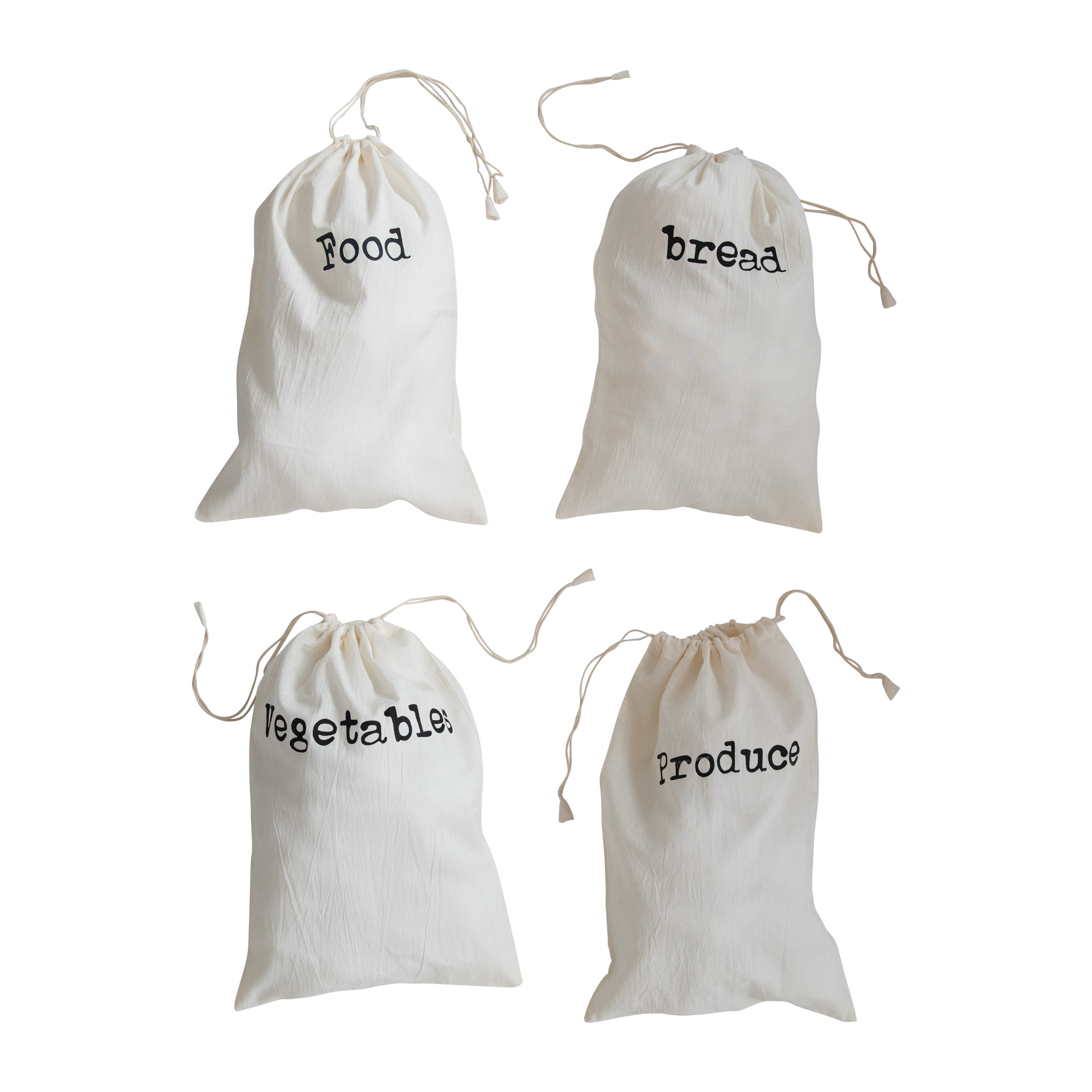 Catalog Name: 12"L x 18"H Cotton Printed Reusable Drawstring Food Bags, White & Black, 4 Styles