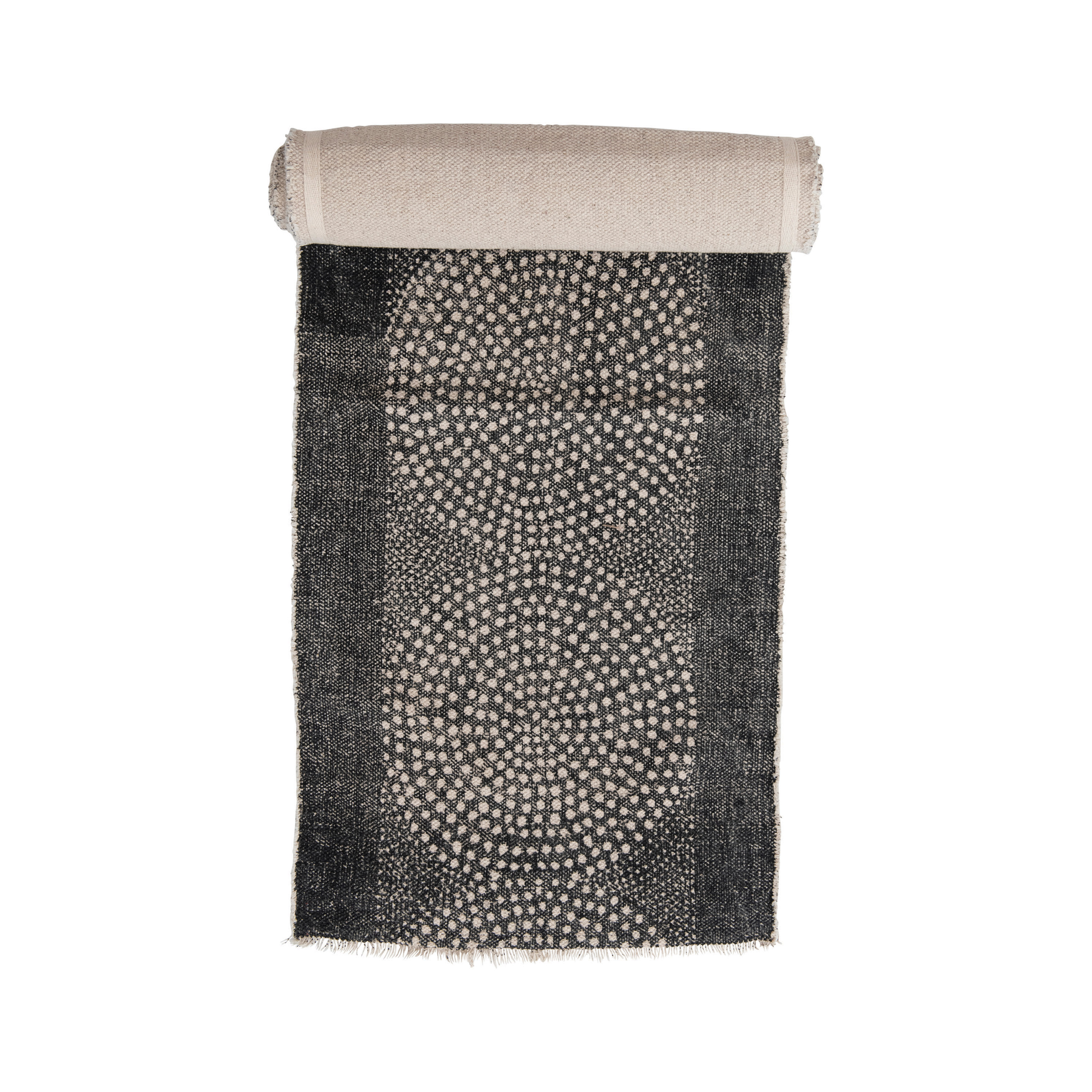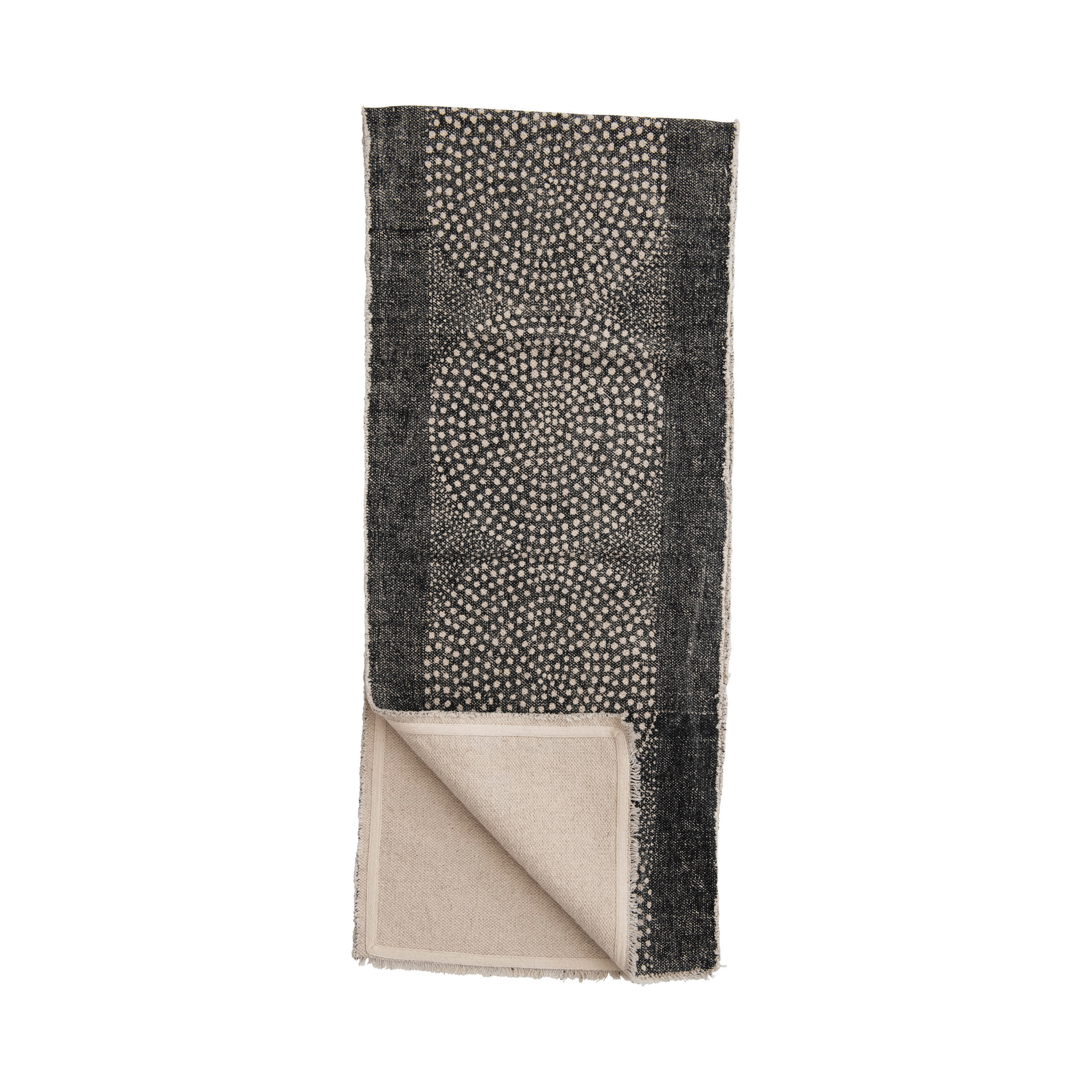 Black stonewashed cotton canvas table runner with dot pattern and frayed edges; Machine Wash Cold, Gentle Cycle, Do not Bleach, Tumble Dry Low, Warm Iron If Needed, Trim And Comb Edges After Washing. Add a touch of style to any dining space with this rustic table runner. Made from cotton blend. Curate a space that reflects your unique sense of style with intentionally designed home décor.