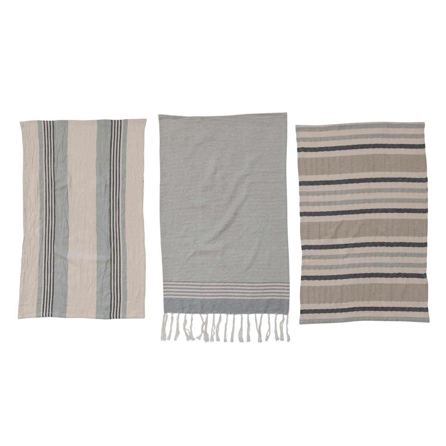 Featuring a vast selection of lush woven textures, intricate details, and timeless patterns, our collection of kitchen textiles will bring warmth and elegance to a dining space of any style. Instantly transform a breakfast nook or dining room into a sophisticated sanctuary by exploring a vast array of textiles and accessories fit for any space including table runners, napkin sets, placemats, napkin rings, tea towels, dish cloths, sponge cloths, pot holders, food pouches, aprons, and so much more. Choose from a wide variety of luxurious fabrics from cotton and velvet to linen and seagrass, and styles from mid-century modern and boho to classic farmhouse and contemporary. This casual set of cotton tea towels features a striped pattern and decorative fringe tied with a jute and wood bead tie. Display in a living or dining space of any style from farmhouse to cottage. Machine Wash Warm, Gentle Cycle, Do Not Bleach, Tumble Dry Low, Warm Iron If Needed. Made from cotton.
