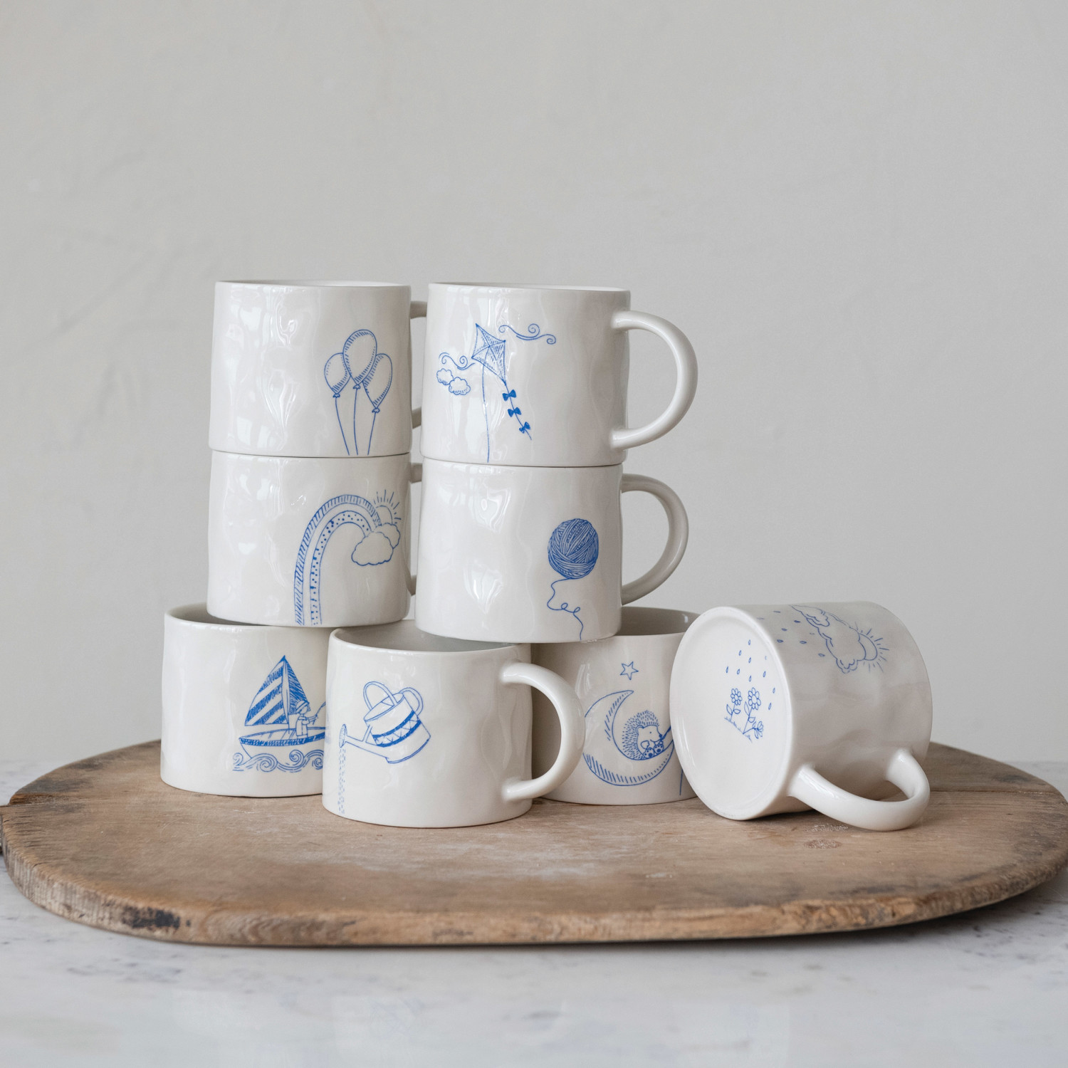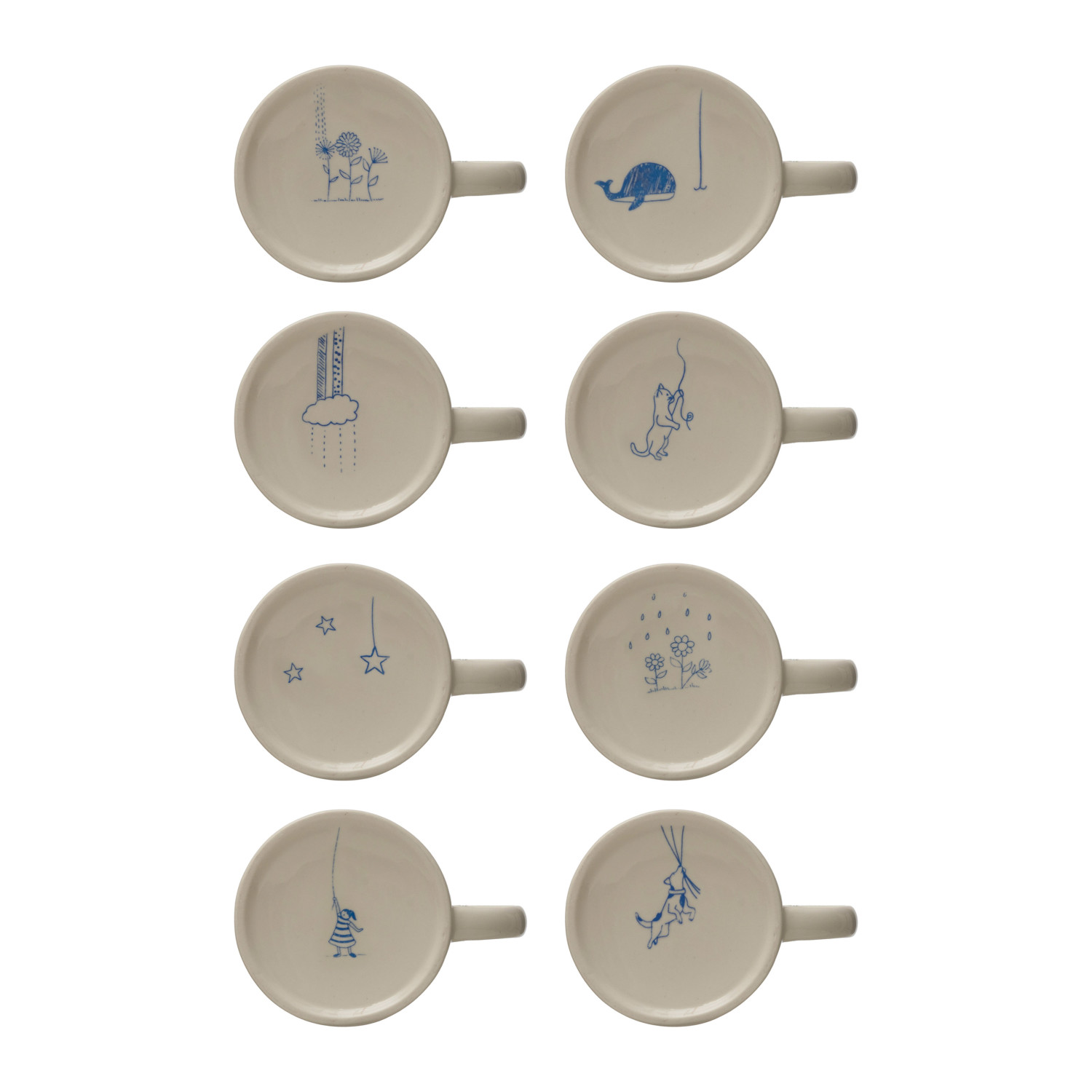 This whimsical set of stoneware mugs showcases 8 playful wax relief illustrations with accompanying hidden images on bottom.