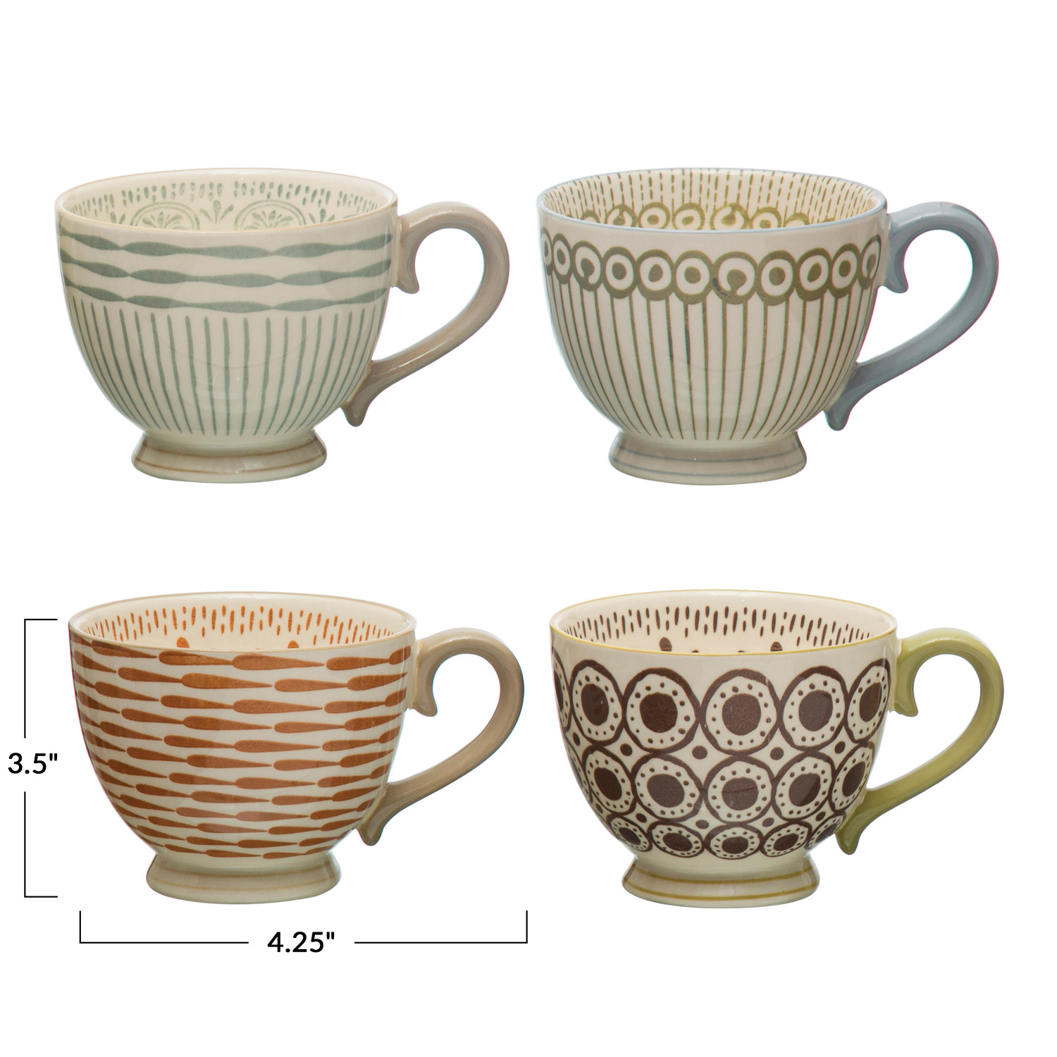 Our thoughtfully crafted collection of drinkware showcases an expansive selection of material compositions and artisanal silhouettes designed for the modern host. Explore a wide array of pieces that are both fashionable and functional including drinking glasses, mugs, stemmed champagne glasses, stemless wine glasses, espresso cups, and so much more. Choose from a vast selection of materials from stoneware to glass, and styles from classic farmhouse and mid-century modern to vintage glam and contemporary boho. Add a touch of beauty and sophistication to a special occasion or daily routines with this carefully curated collection of drinkware that is sure to impress. This cottage-inspired set of stoneware mugs showcases 4 styles of intricately painted designs. This piece is food safe. Dishwasher safe. Made from stoneware.