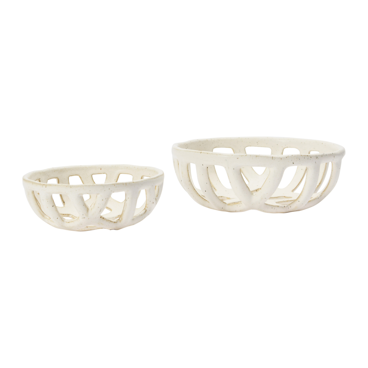 This set of 2 handmade stoneware basket bowls features a reactive glaze in a serene white color, ensuring no two pieces are exactly alike. The larger bowl measures 8 inches round by 3 inches high, while its companion measures 6 inches round by 2.25 inches high. Each bowl is crafted to be food-safe and requires hand washing to maintain its bespoke beauty. Ideal for both serving and display purposes, these bowls offer a blend of functionality and artistry that will vary slightly from piece to piece, adding a personalized touch to the home collection. Made of hand-thrown stoneware, these bowls boast a reactive glaze that makes each one distinctively charming.