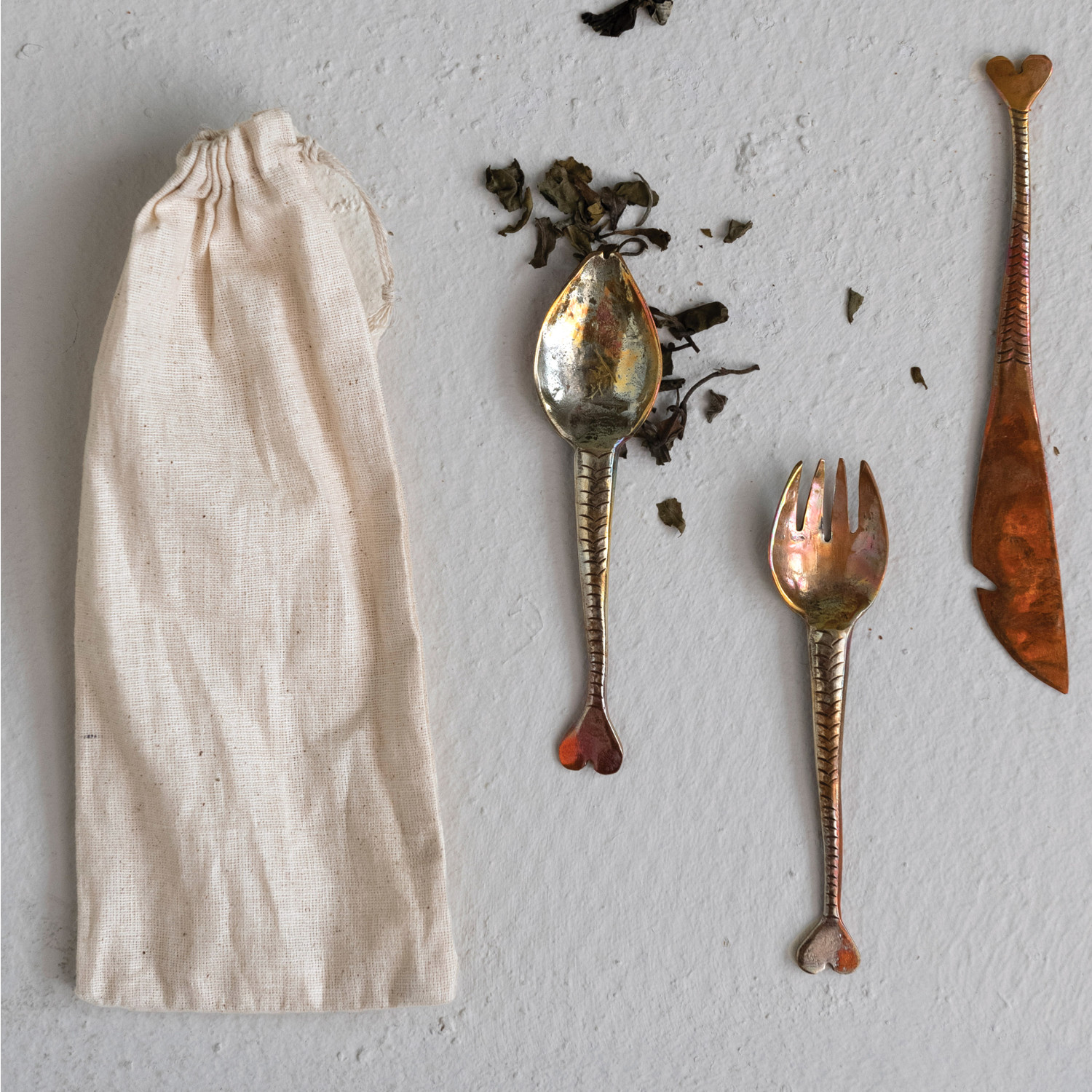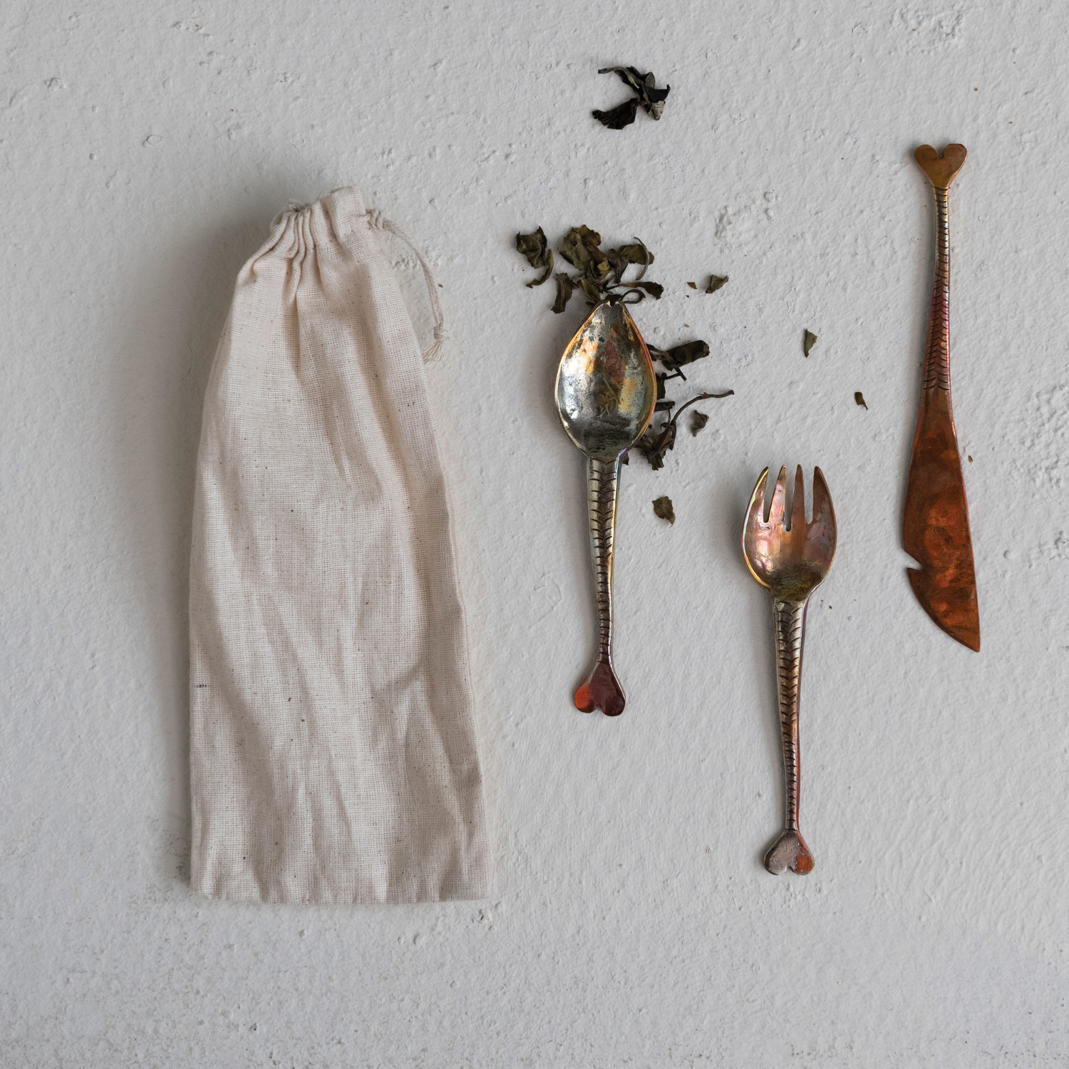 Hand-Forged Copper Appetizer Cutlery, Set of 4 in Printed Drawstring Bag