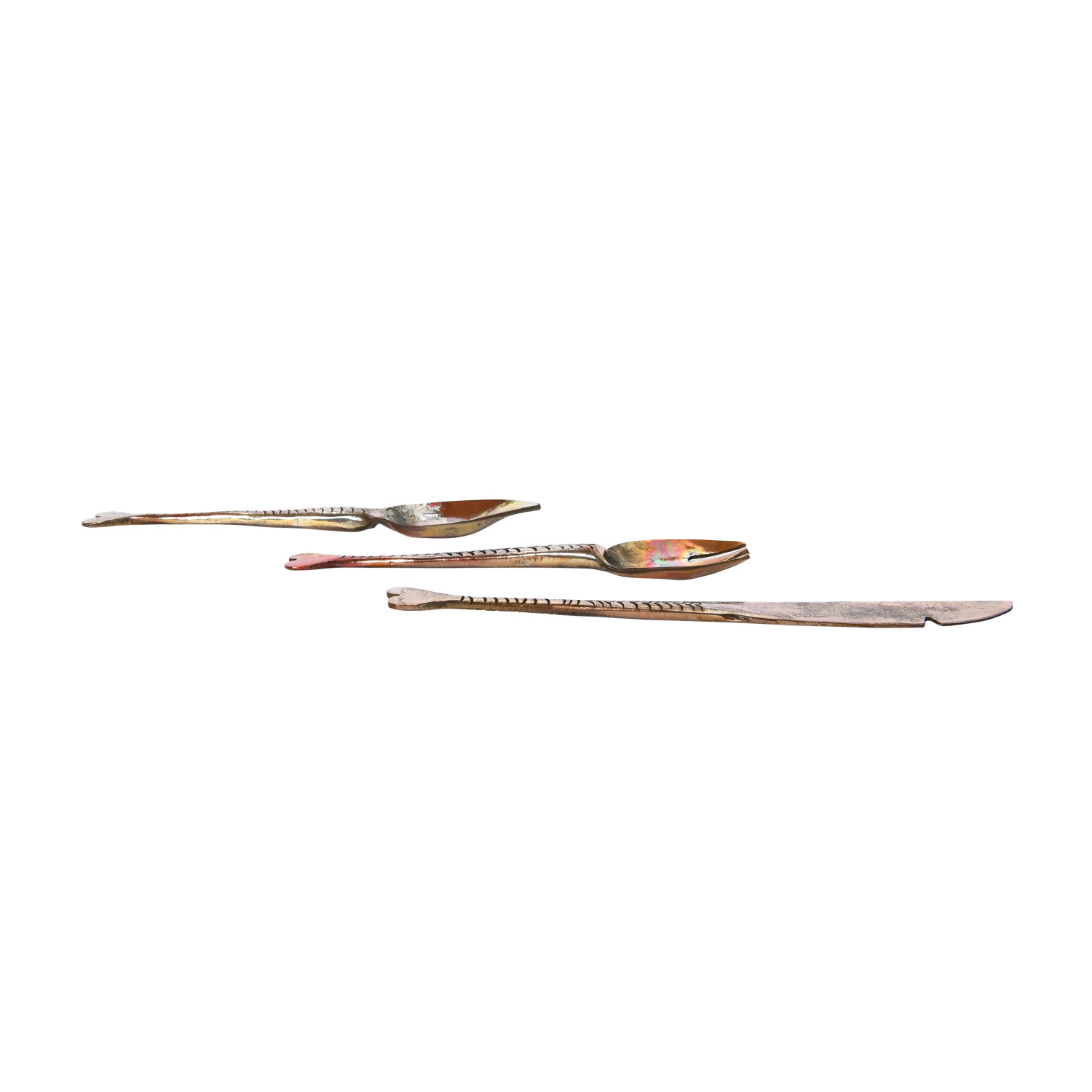 Catalog Name: 5-1/2"L Hand-Forged Copper Appetizer Set w/ Fish Tail Handles, Burnt Finish, Set of 3 in Printed Drawstring Bag