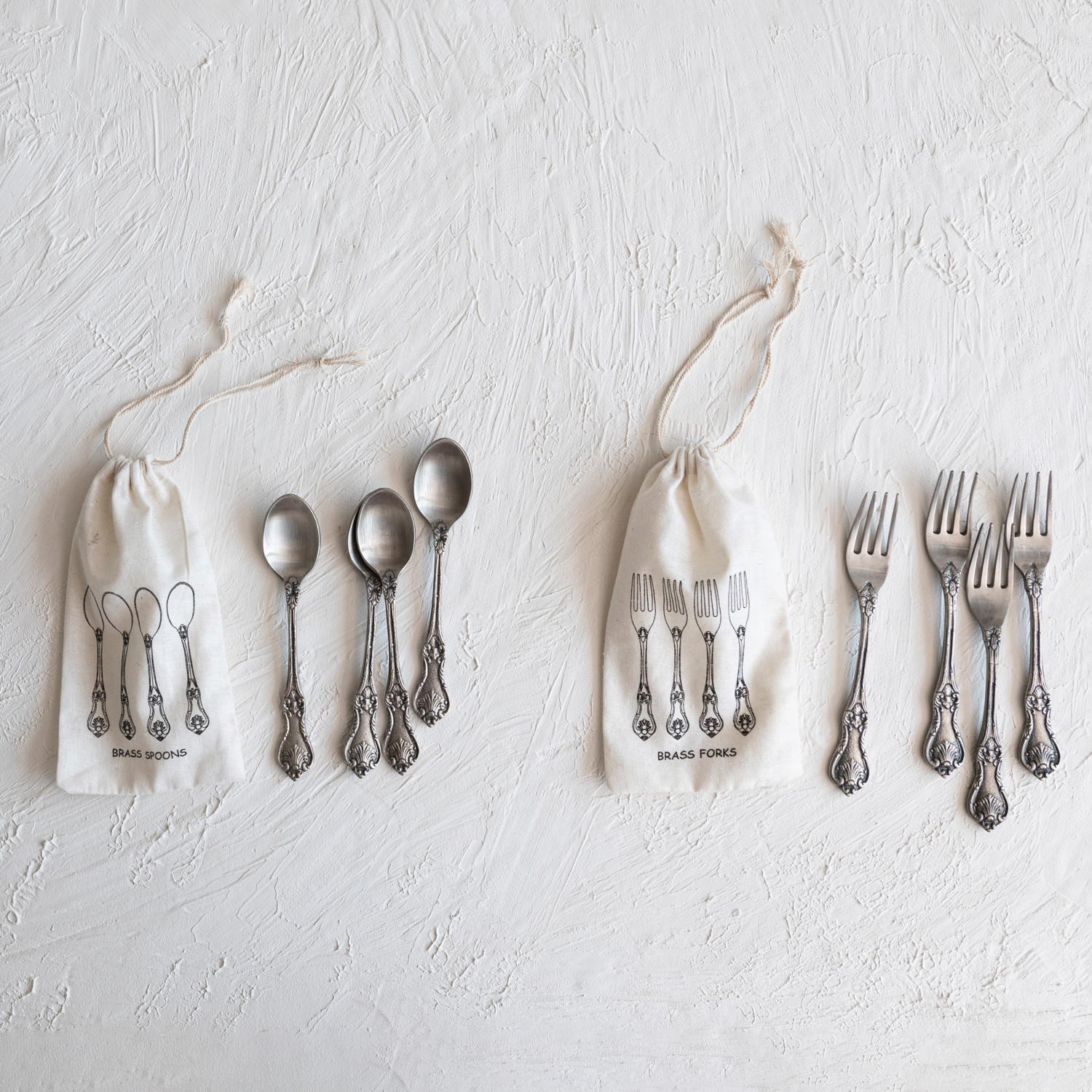 Catalog Name: 5"L Embossed Brass Spoons, Antique Silver Finish, Set of 4 in Printed Drawstring Bag
