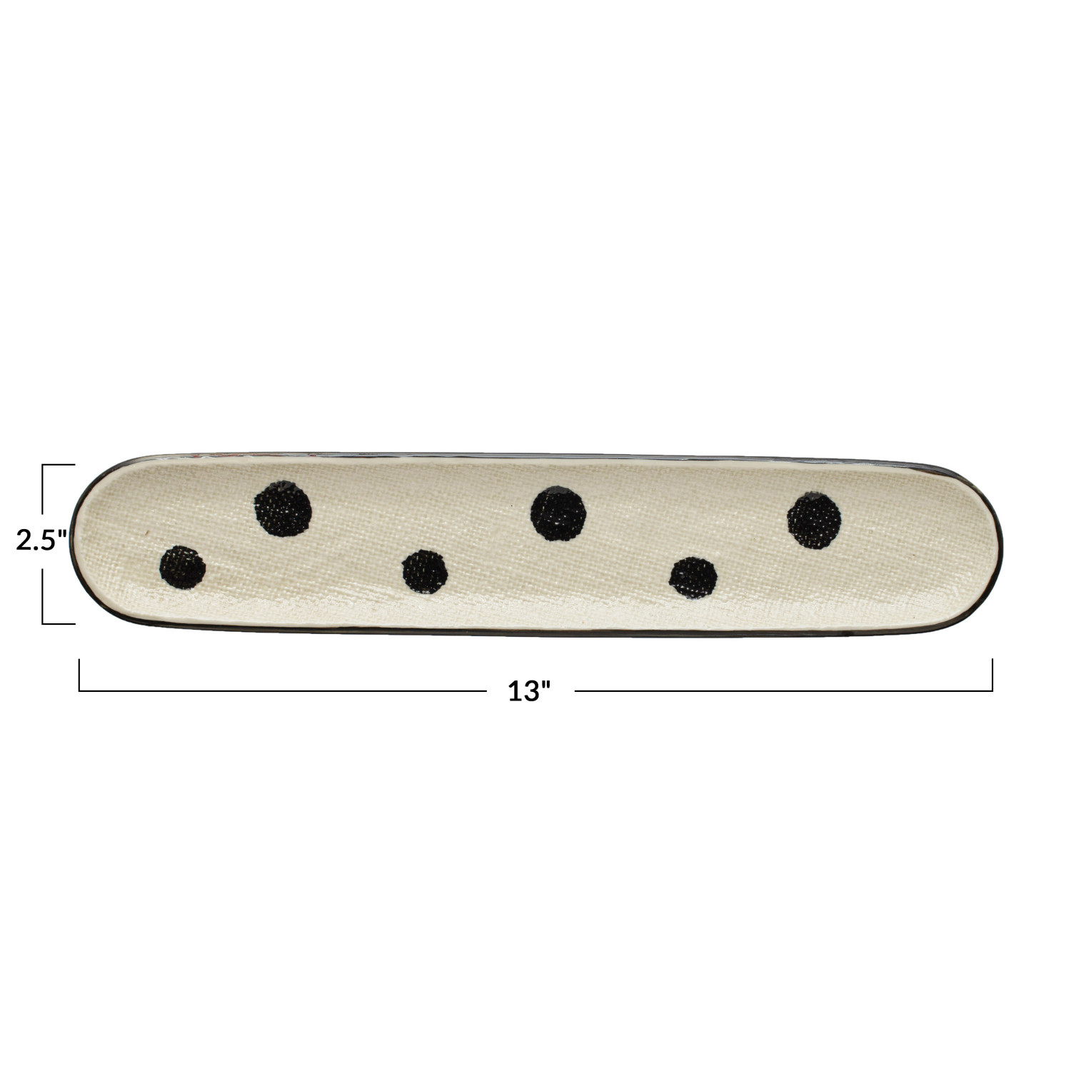Catalog Name: 13"L x 2-1/2"W Oval Hand-Painted Stoneware Tray w/ Dots & Linen Texture, Black & Cream Color