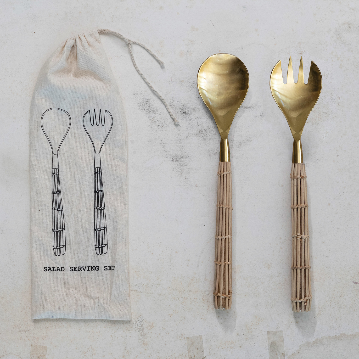 Catalog Name: 12"L Stainless Steel Salad Servers w/ Rattan Handles, Brass Finish & Natural, Set of 2 in Printed Drawstring Bag