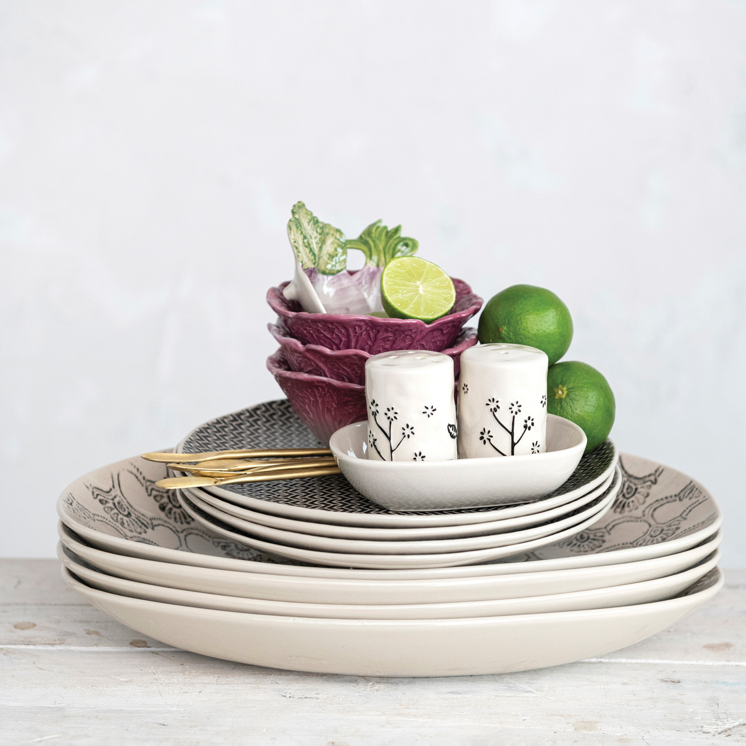 Catalog Name: 5-1/2"L x 4"W Hand-Painted Stoneware Dish w/ Embossed Flowers, Cream Color & Black