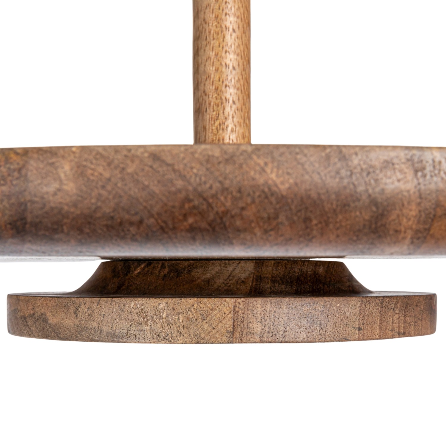 This mango wood 2-tier tray is a rustic and elegant accessory that will enhance the home with its natural color and round shape. The 2-tier tray is made of natural mango wood, a sustainable and eco-friendly material known for its strength and durability. The mango wood has a natural color and grain, adding warmth and character to the space. The 2-tier tray has a sturdy metal handle and is easy to carry. Use it to store and display various items such as fruits, snacks, candles, plants, or ornaments. It has a simple and elegant design that can complement any farmhouse, lodge, Scandinavian, cottagecore, or cabin-style decor. The 2-tier tray can be placed on a table, a counter, a shelf, or a mantel, adding a touch of nature and functionality to the home. It measures 13 inches in diameter and 16 inches in height. Whether for everyday use or special occasions, this mango wood 2-tier tray will add a touch of nature and functionality to any home.