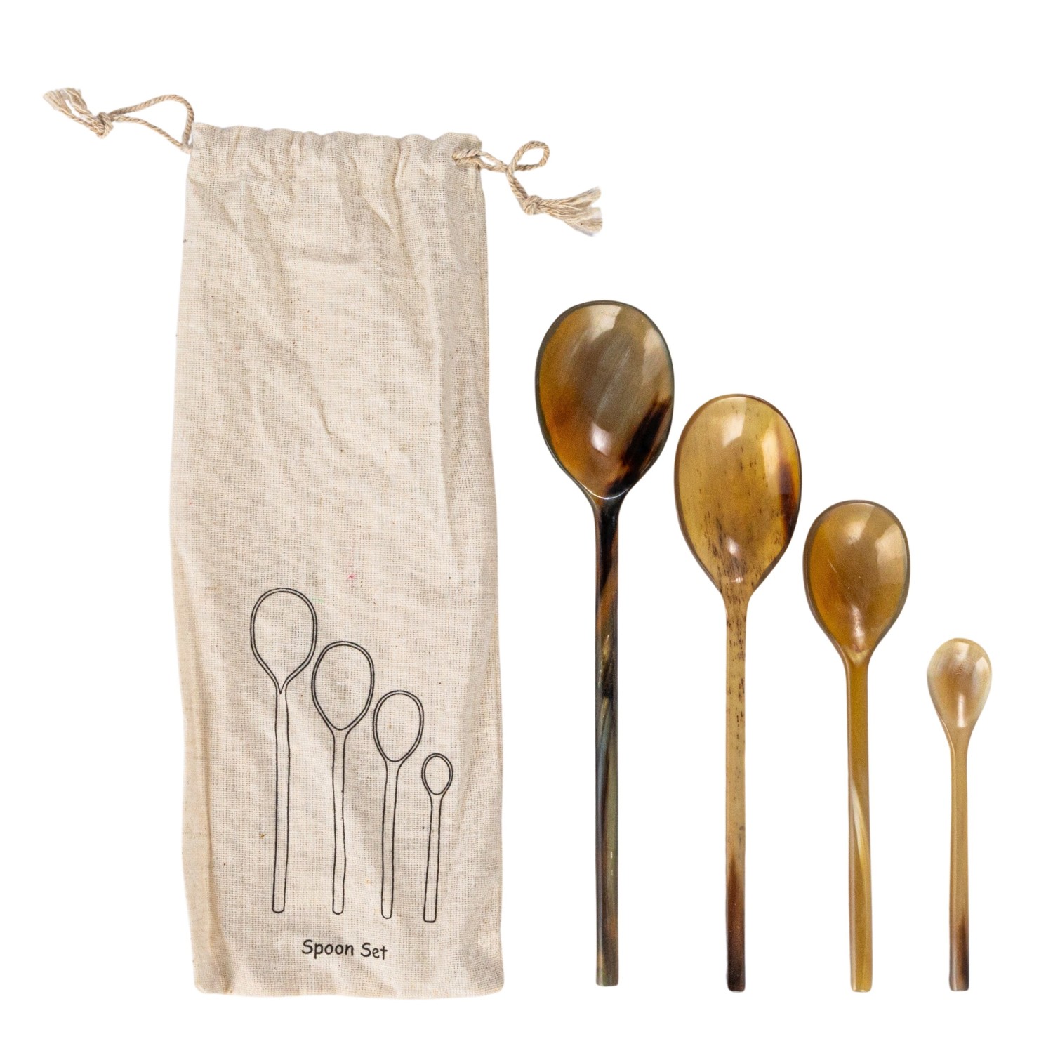 Catalog Name: 4"L - 7-3/4"L Natural Horn Measuring Spoons, Set of 4 in Printed Drawstring Bag (Each One Will Vary)