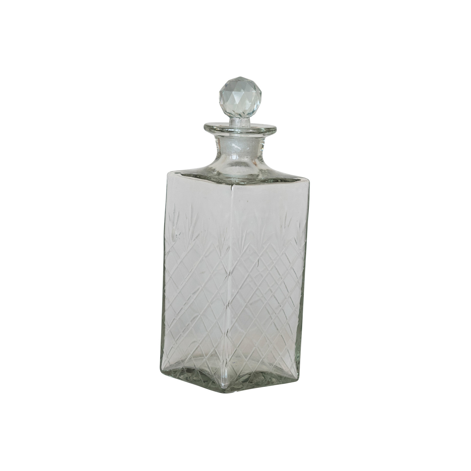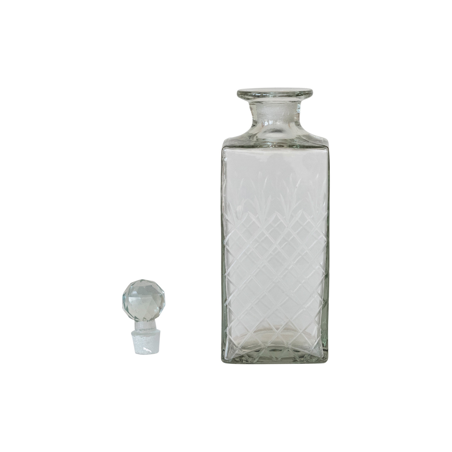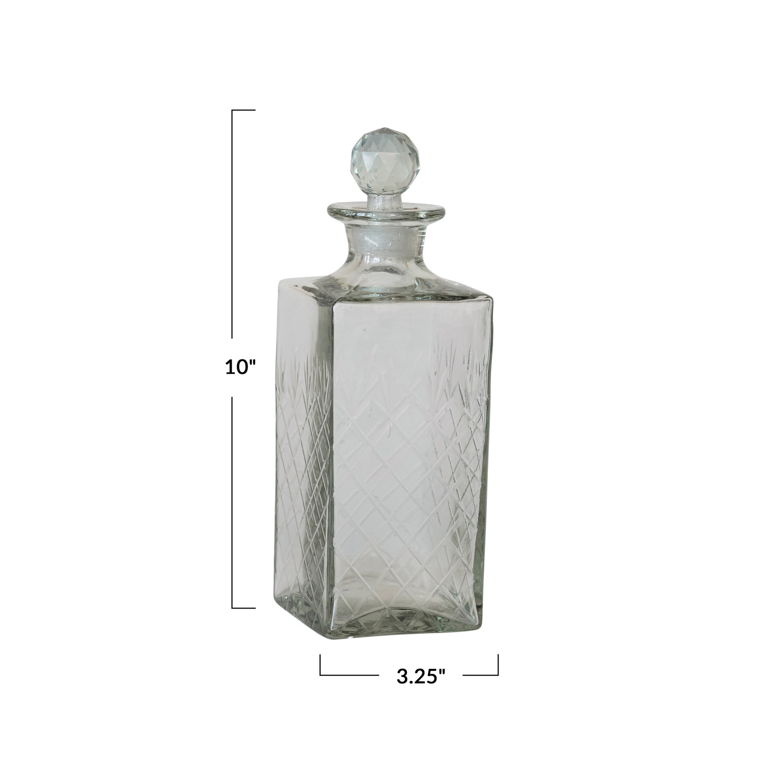 Catalog Name: 3-1/4" Square x 10"H 30 oz. Recycled Etched Glass Decanter w/ Glass Stopper