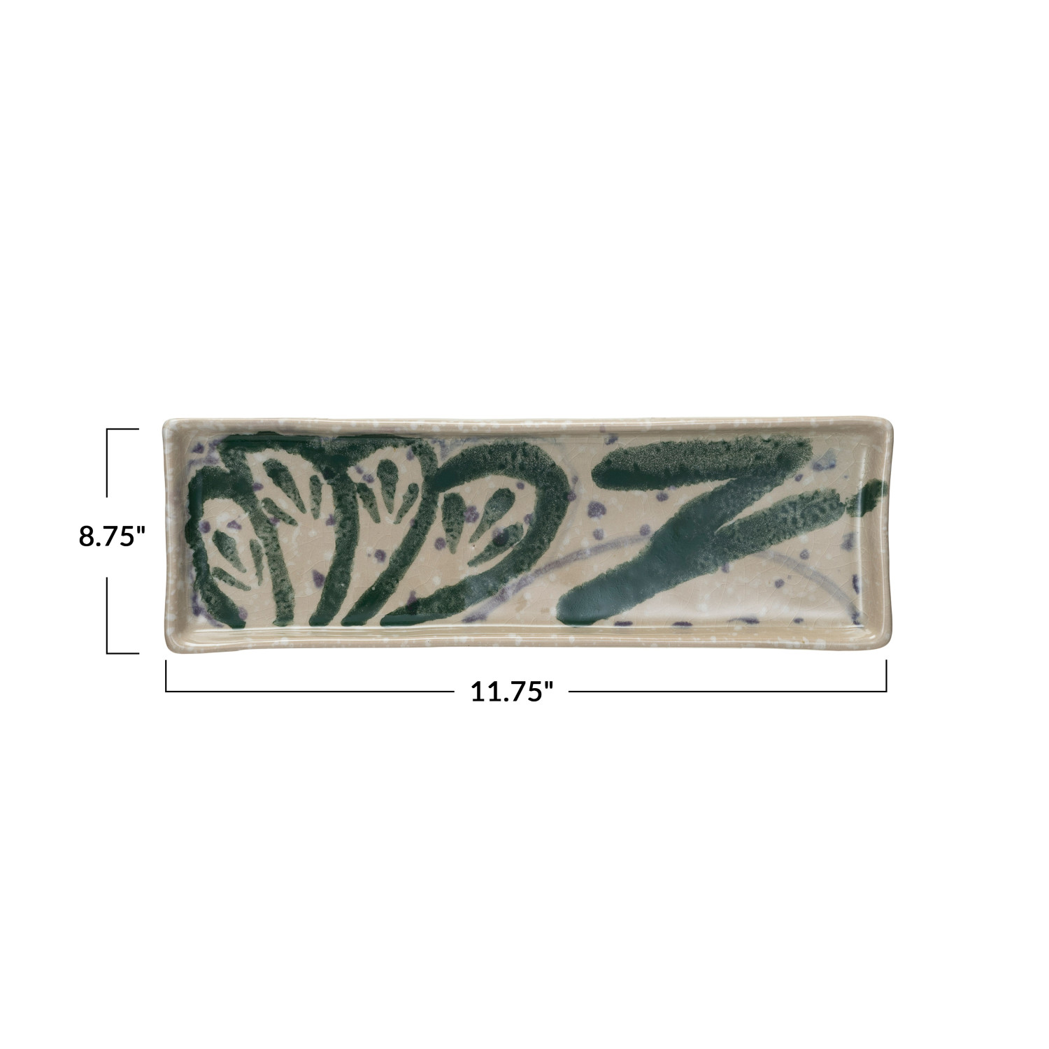This green and cream hand-painted stoneware platter features an abstract design and a crackle glaze, adding depth and texture to the design. The reactive glaze not only enhances the visual appeal but also protects the hand-painted artwork. Made from robust stoneware, it can withstand frequent use while maintaining its beauty. The platter's ample size allows for a generous display of culinary delights, making it perfect for home or special events. Its aesthetic versatility makes it suitable for various decor themes, including coastal, farmhouse, beach, lodge, and abstract. Measuring 11.75 inches long, and 8.75 inches wide, it offers ample space for creative food arrangements. Whether used for casual or formal occasions, this green and cream stoneware platter is a focal point in the dining experience.