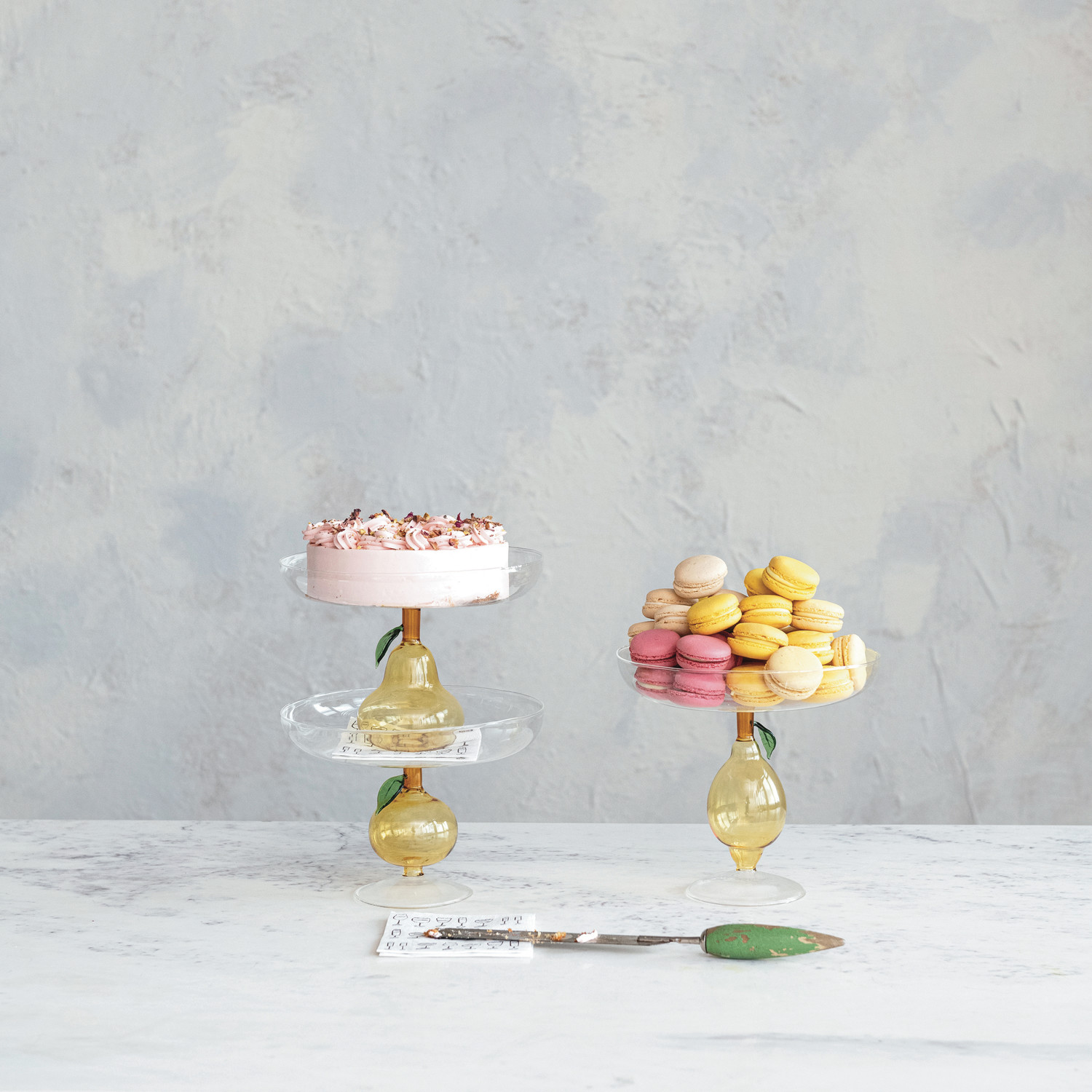This Glass Food Pedestal, with its pear-shaped base, stands at 5.75 inches tall and spans 7.75 inches in diameter, presenting a perfect blend of form and function. The green and amber hues of the base are reminiscent of a ripe pear, inviting a sense of natural beauty to the table. It's an ideal stage for baked goods or other culinary creations, adding a touch of elegance to any dining experience. The durable glass construction ensures long-lasting use and easy cleaning, making it a practical and stylish addition to the kitchenware collection. Whether it's part of a casual brunch or an elegant dinner, this food pedestal is a celebration of the simple yet profound joy of sharing food in good company.
