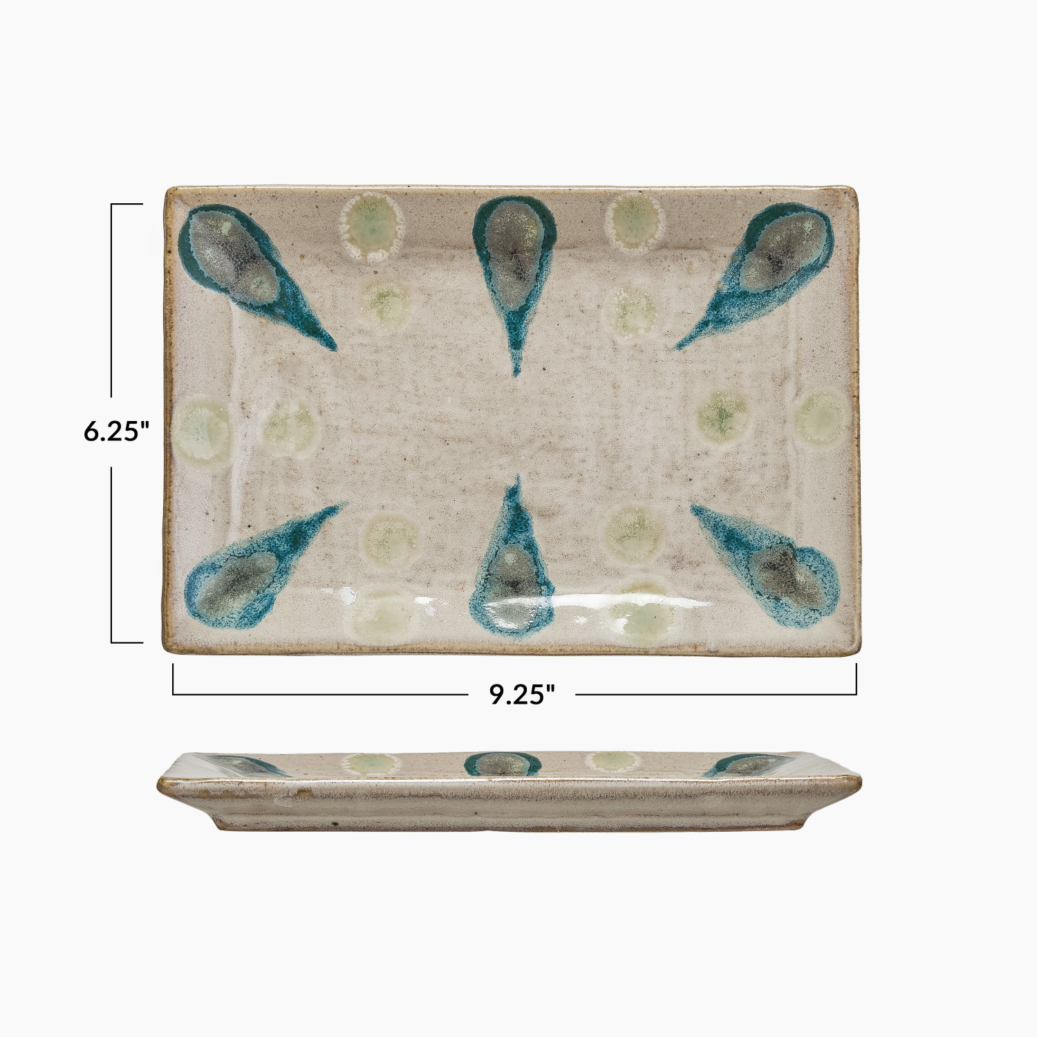 Catalog Name: 9-1/4"L x 6-1/4"W Hand-Painted Stoneware Platter, Reactive Glaze, Green, Blue & Cream Color (Each One Will Vary)