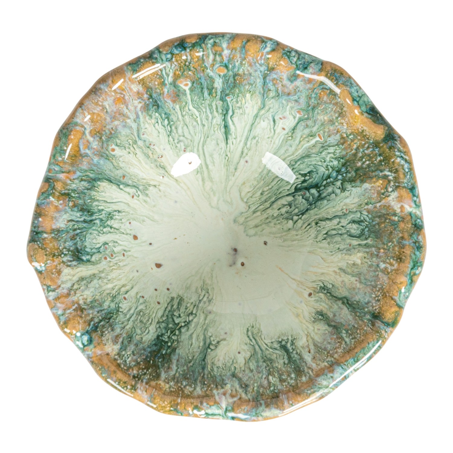This Round Stoneware Bowl stands proudly on a flared foot, its rounded body coated in a green and brown speckled glaze that calls to mind the rich tapestry of a woodland clearing. The earthy tones and tactile finish evoke a sense of grounding and connection to the natural world, making it a serene addition to any home. Whether serving as a vessel for favorite snacks or as a standalone piece of art, this bowl's charming presence is a nod to the understated beauty of rustic life. It measures 4.25 inches in diameter and 3.75 inches in height, providing a compact yet visually striking presence. It's a functional piece that doesn't shy away from making a statement, embodying the spirit of pastoral elegance with a modern twist.