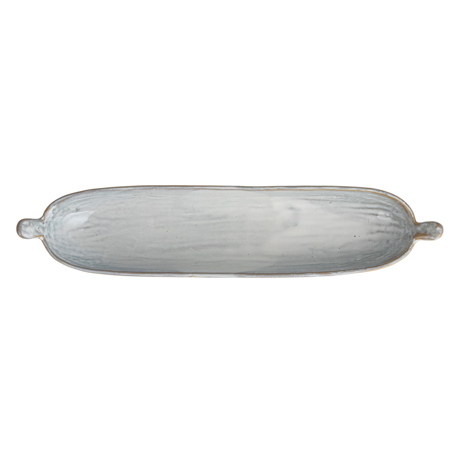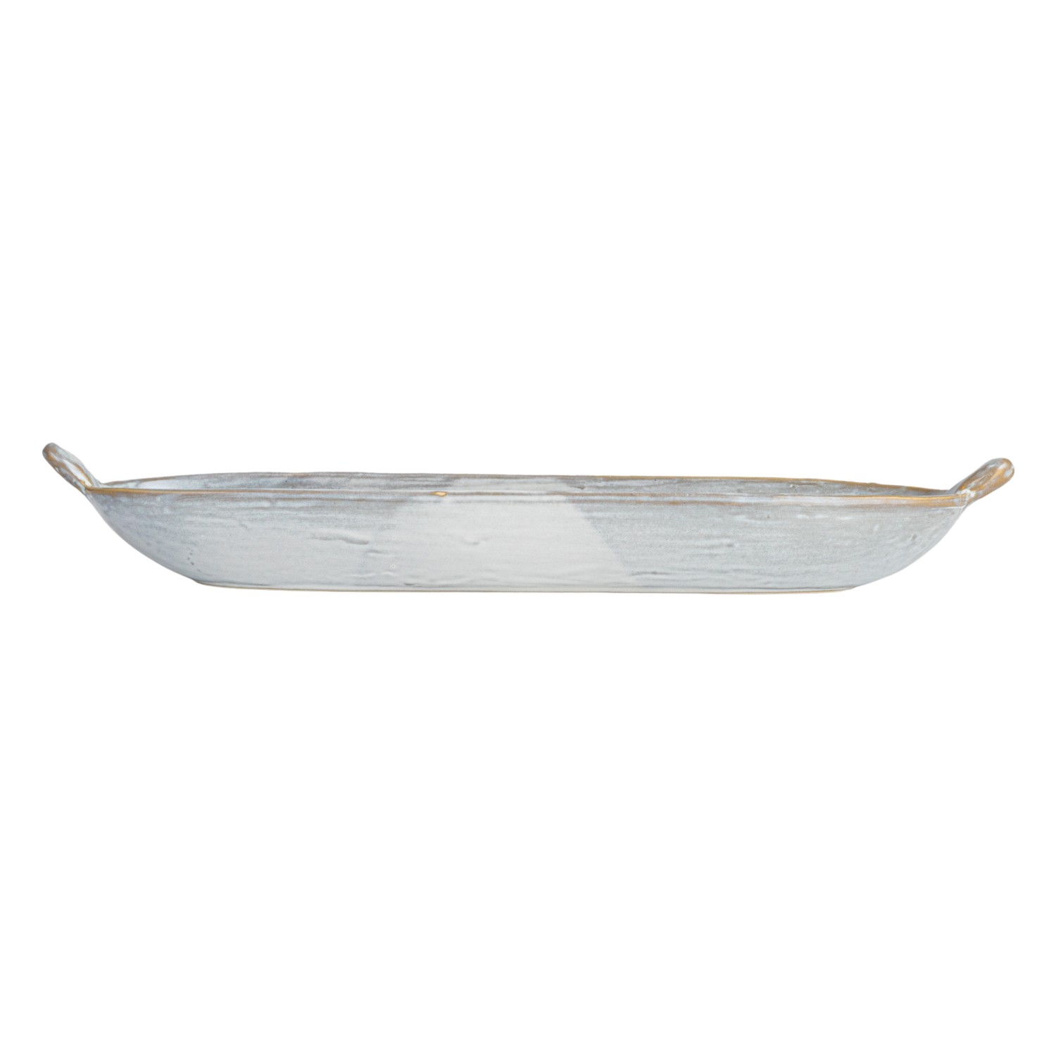 Catalog Name: 13-1/4"L x 3"W x 2"H Stoneware Platter w/ Handles, Reactive Glaze, White (Each One Will Vary)