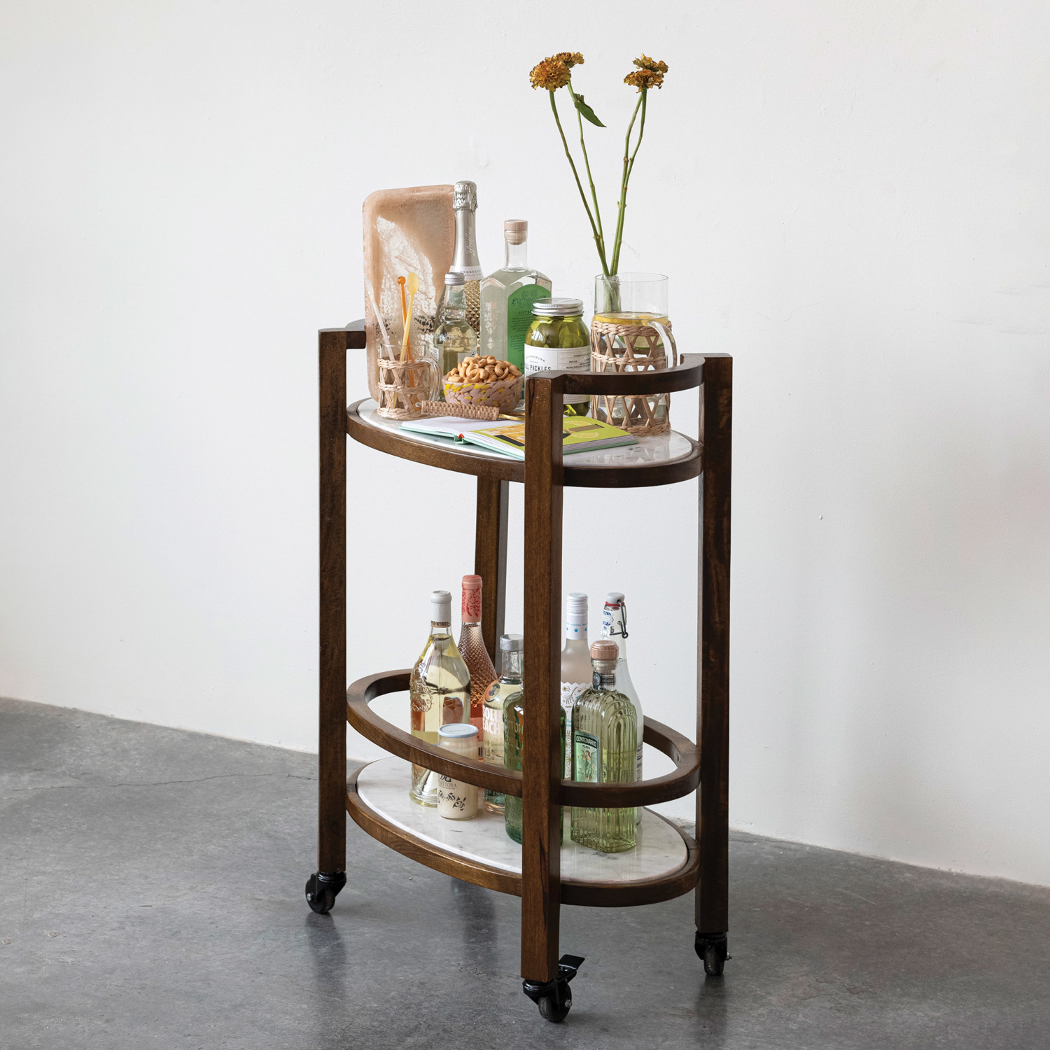 This mango wood and marble 2-tier bar cart in walnut finish and white is a versatile and elegant addition to any decor. It features a smooth mango wood frame and two marble shelves in a natural and luxurious finish. The contrast between the two materials creates a refined look, making it suitable for various settings like farmhouse, French country, mid-century modern, Scandinavian, or coastal themed decor. The cart is ideal for serving drinks, snacks, or appetizers, and its spacious design allows for easy mobility. It can be placed in various rooms, and its durable materials, such as mango wood and marble, make it easy to clean. The cart measures 25.5 inches in length, 14 inches in width, and 33.5 inches in height, making it a great gift for anyone.