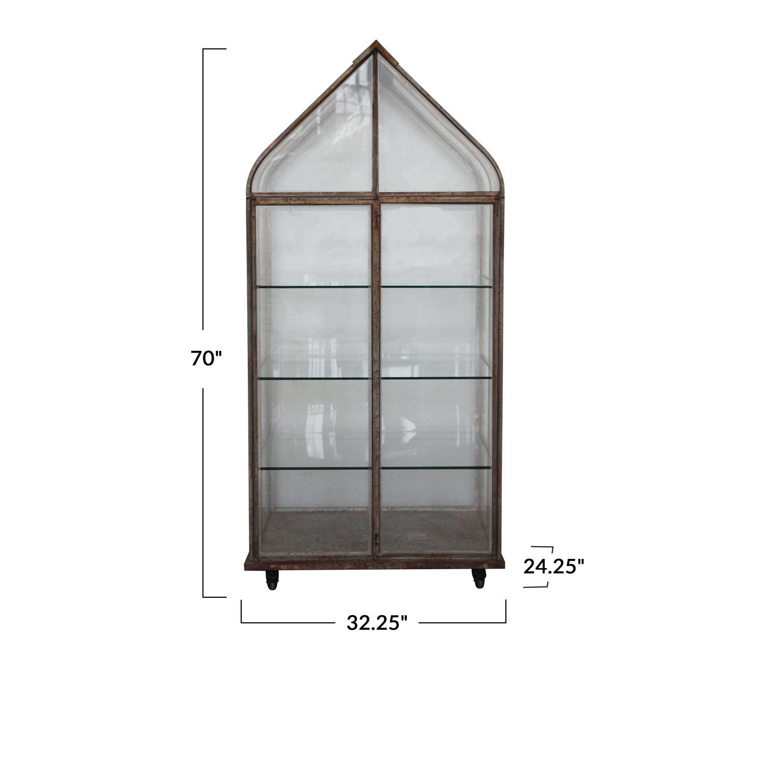 This Metal and Acrylic Terrarium, standing tall on caster wheels, is a beautifully distressed piece that brings a touch of vintage charm to any setting. Its three glass shelves offer a combined weight capacity of 51 pounds, perfect for an array of potted greens or decorative items. The terrarium's generous size, 32.25 inches long by 24.25 inches wide by 70 inches high, makes it a versatile addition to the home. Whether placed in a sunlit corner or as a centerpiece, this terrarium on wheels is a delightful blend of form and function, ready to roll into heart and home. Each piece varies, adding to its unique character.