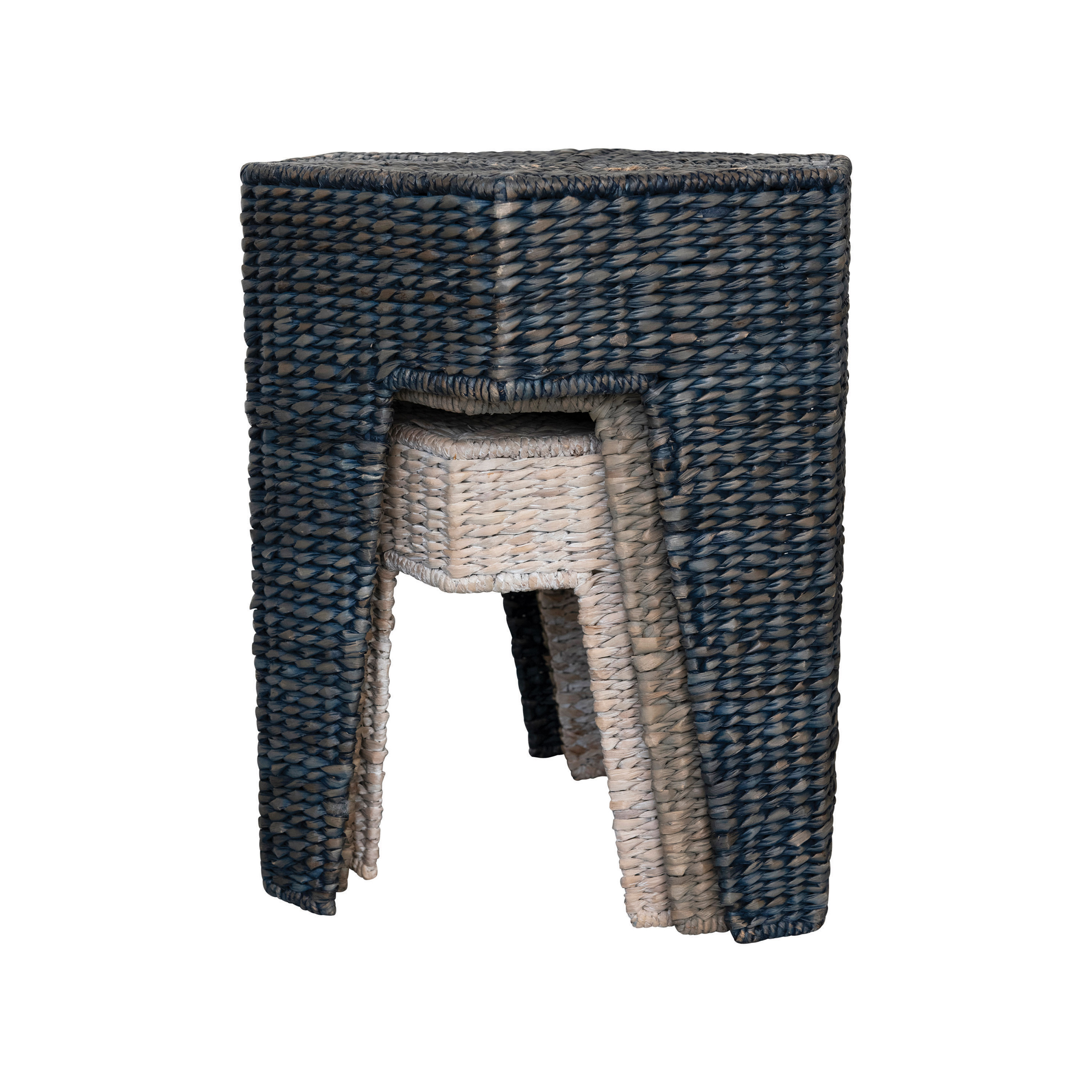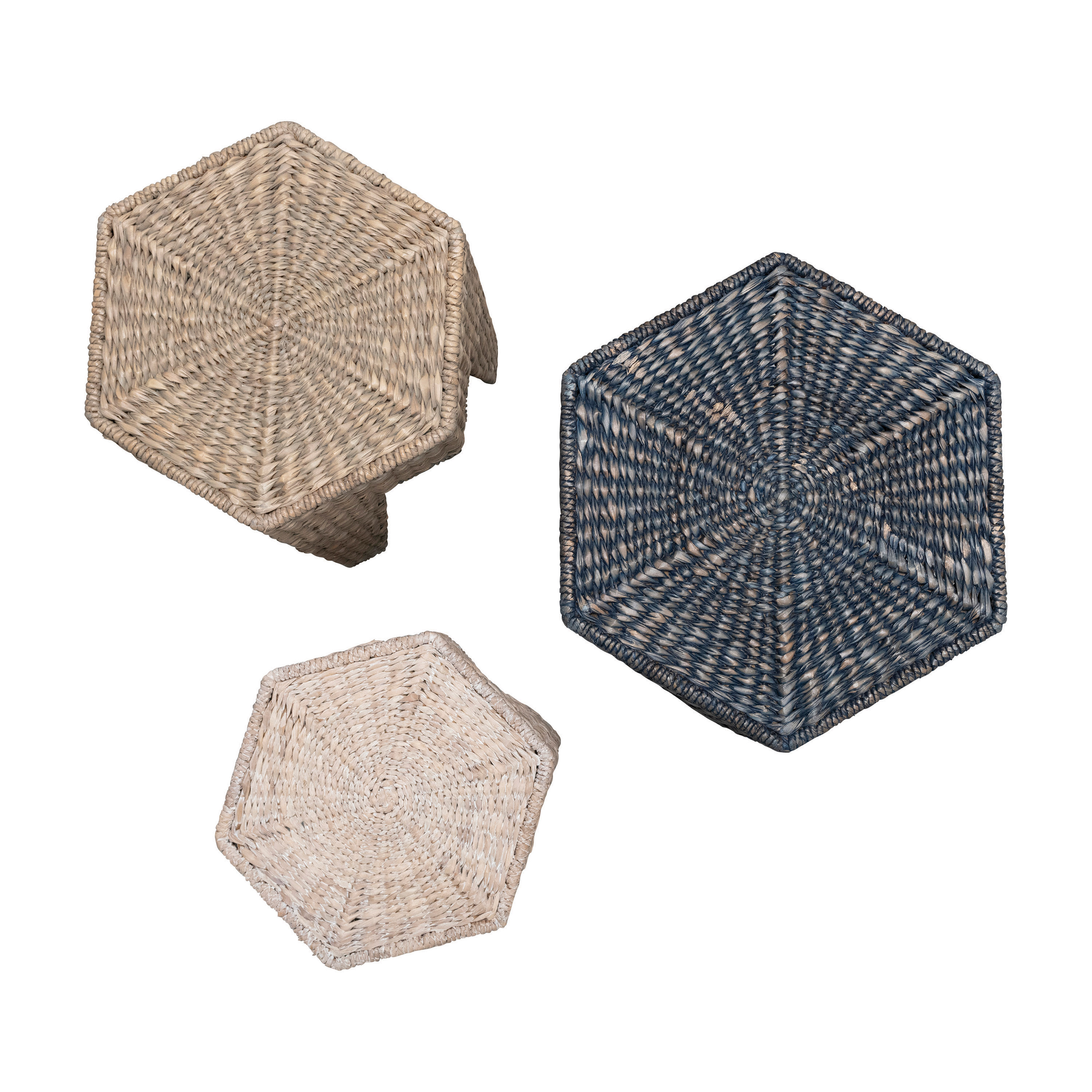 Catalog Name: 21-1/2"L x 21-1/2"W x 24"H, 16"L x 16"W x 22-1/4"H & 16-1/2"L x 16-1/2"W x 16-1/4"H Hexagon Hand-Woven Water Hyacinth & Rattan Stools/Nesting Tables, Blue, Grey & Whitewashed, Set of 3