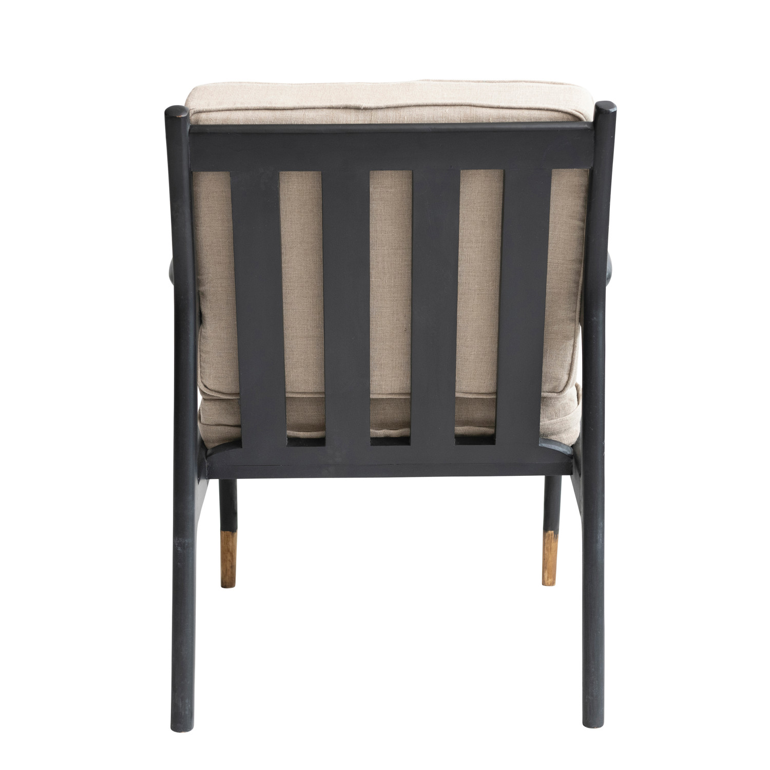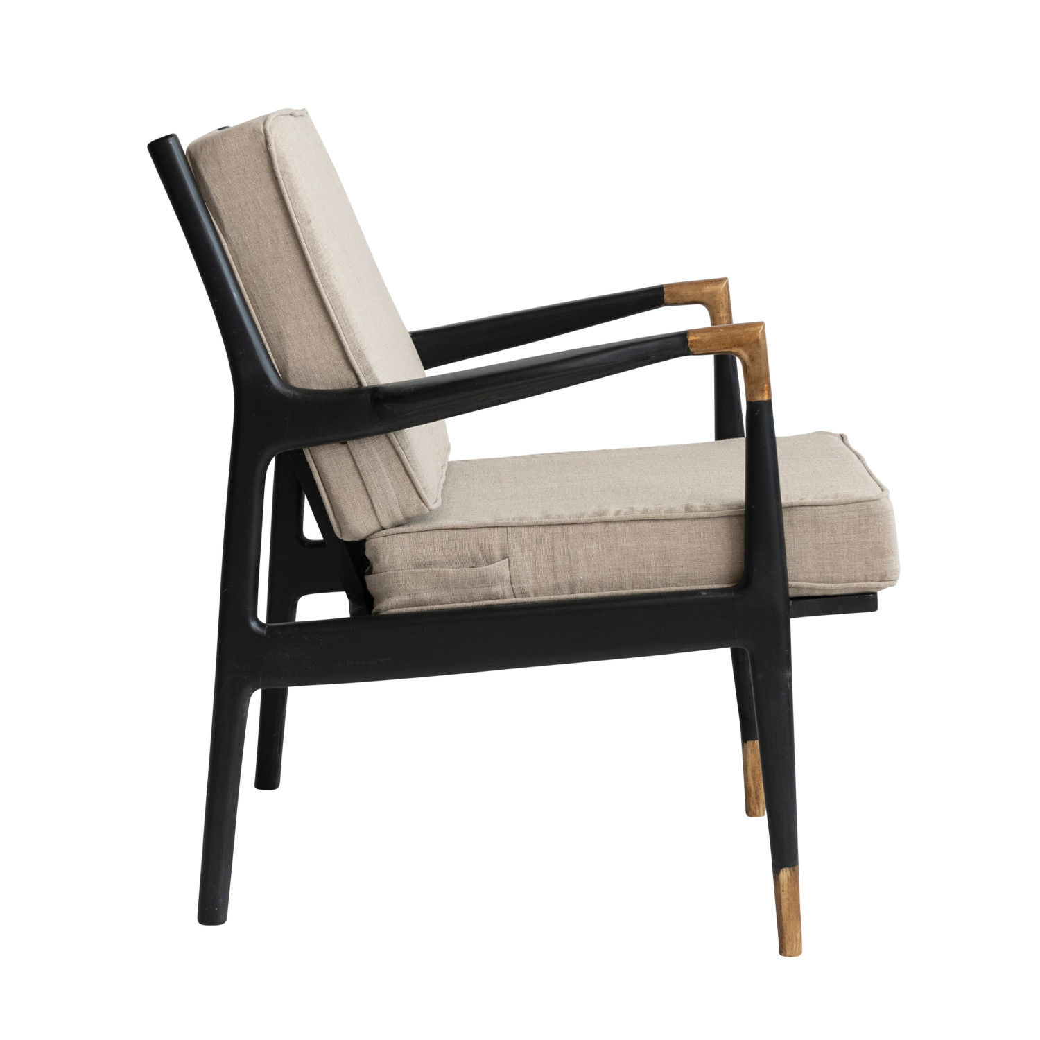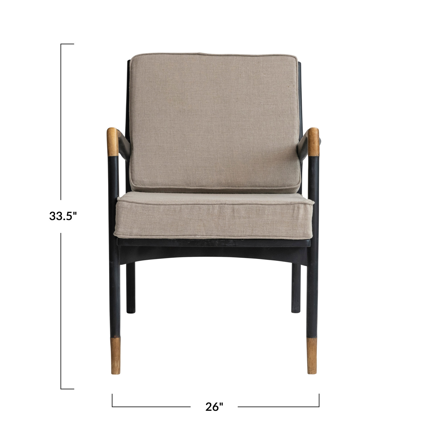 Catalog Name: 26"W x 32"D x 33-1/2"H Mango Wood Chair w/ Linen Cushions & Metal Capped Feet & Armrests, Black & Brass Finish, Truck Ship