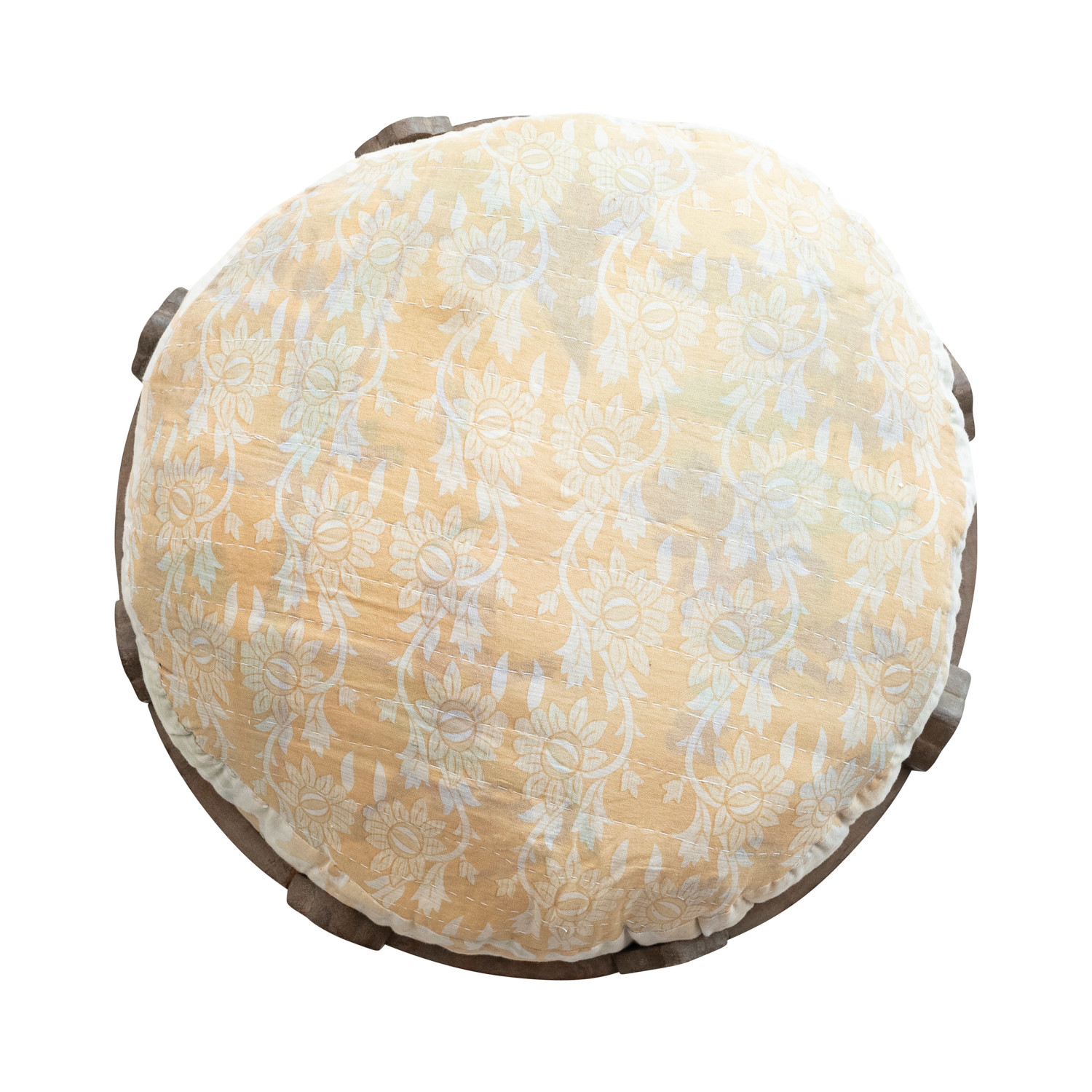 Catalog Name: Approximately 24" Round x 12"H Carved Reclaimed Wood Vintage Reproduction Stool w/ Vintage Cotton Kantha Patchwork Cushion w/ Hand-Embroidered Kantha Stitch, Bleached, Multi Color (Each One Will Vary)