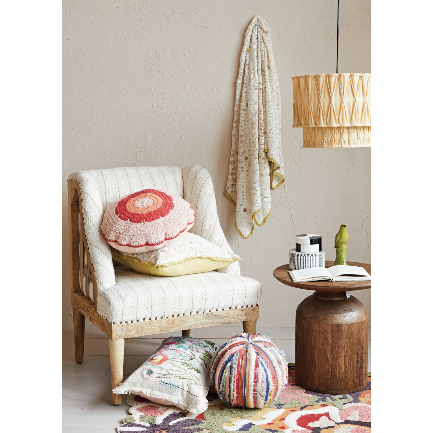 This woven cotton striped chair with mango wood legs and jute latticed sides is a stylish and comfortable addition to any room. Its woven cotton body provides a soft support and a striped pattern, while the mango wood frame and legs add stability and elegance. The jute latticed sides add texture and flair, while the natural color contrasts with the cream. The chair is adorned with gold finish metal nail heads for a touch of style. It can be used as an arm chair, lounge chair, or reading chair, and can be placed in various rooms, including living rooms, bedrooms, study, or sunrooms. The chair is made of eco-friendly cotton and mango wood, making it durable and soft. The chair measures 26.5 inches in length, 27 inches in width, and 35.5 inches in height. It is a versatile and cozy accessory that will enhance the room style and ambiance.