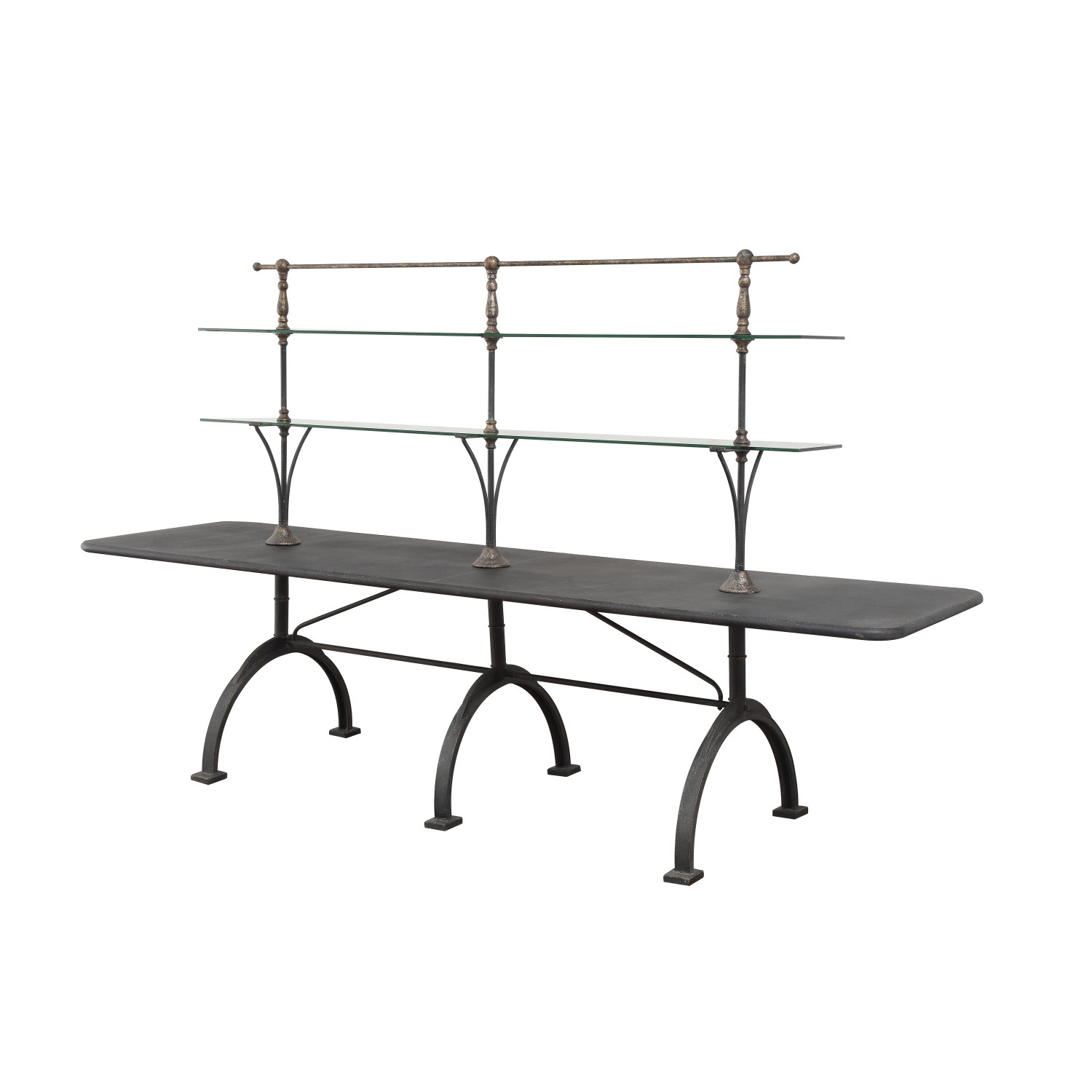 Catalog Name: 118"L x 31-1/2"W x 68-3/4"H Metal Vintage Reproduction Bakery Table w/ 2 Glass Shelves, Distressed Black, KD, Truck Ship