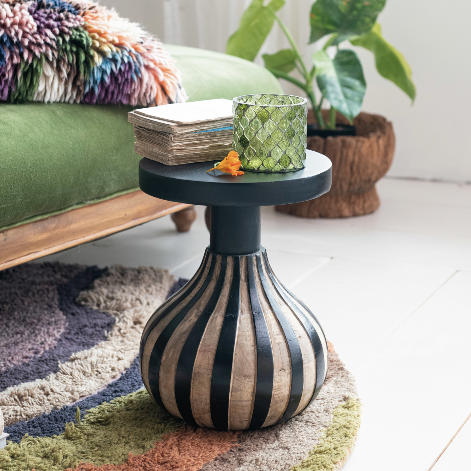 Catalog Name: 11-1/2" Round x 15-1/2"H Mango Wood Table w/ Carved Striped Base, Black & Natural, Truck Ship