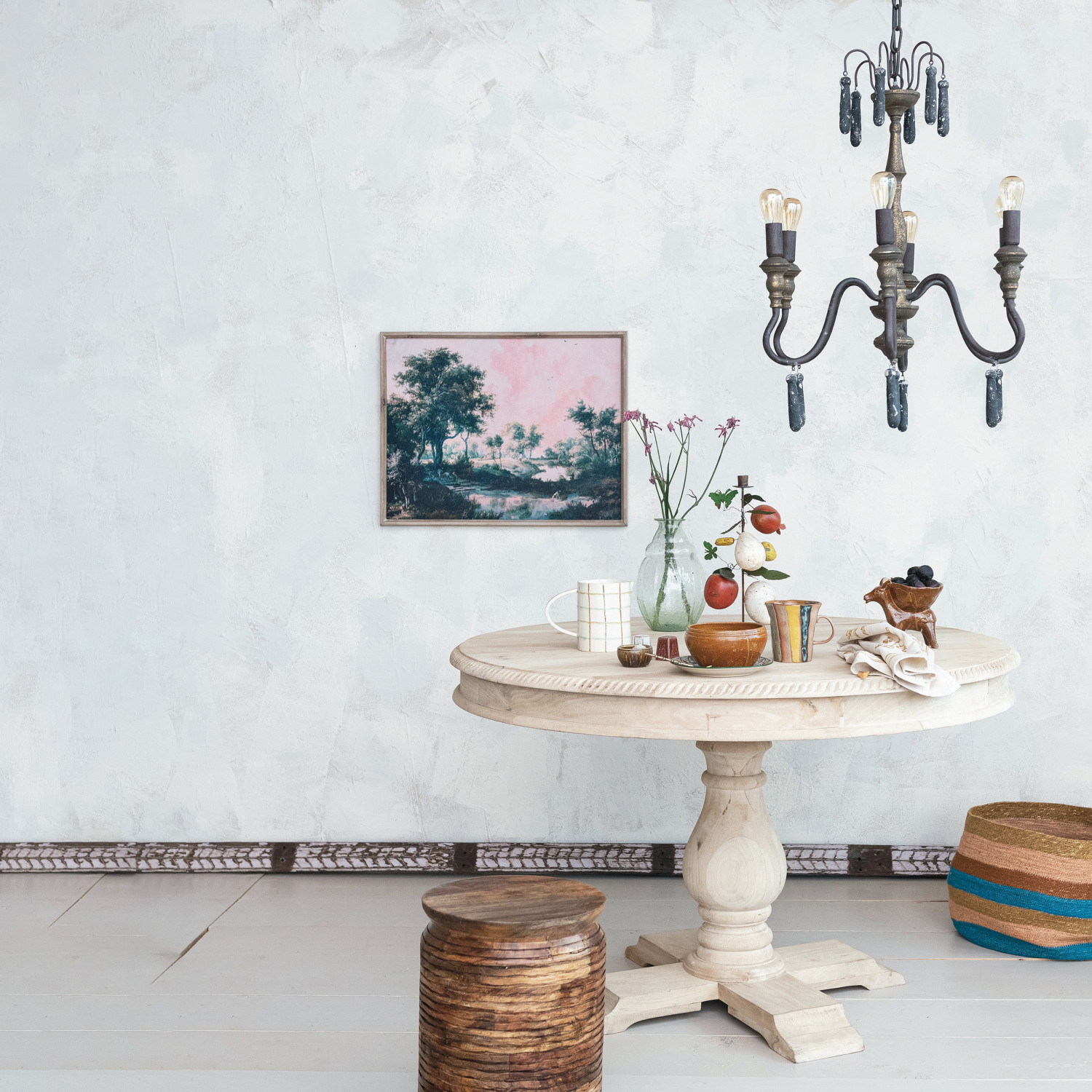 This Rustic Mango Wood and Metal Table is a harmonious blend of strength and style. The round table, measuring 47 inches across and 32 inches tall, offers a generous surface suited for a variety of uses. The natural mango wood top, celebrated for its durability and warm tones, sits atop a sleek metal base, providing a stable and stylish foundation. Whether it's complementing the cozy ambiance of a farmhouse, adding a touch of grace to a French country setting, or bringing a relaxed boho vibe to a space, this table adapts to any lifestyle while making a bold statement. It's not just a piece of furniture; it's the heart of the home where memories are made.