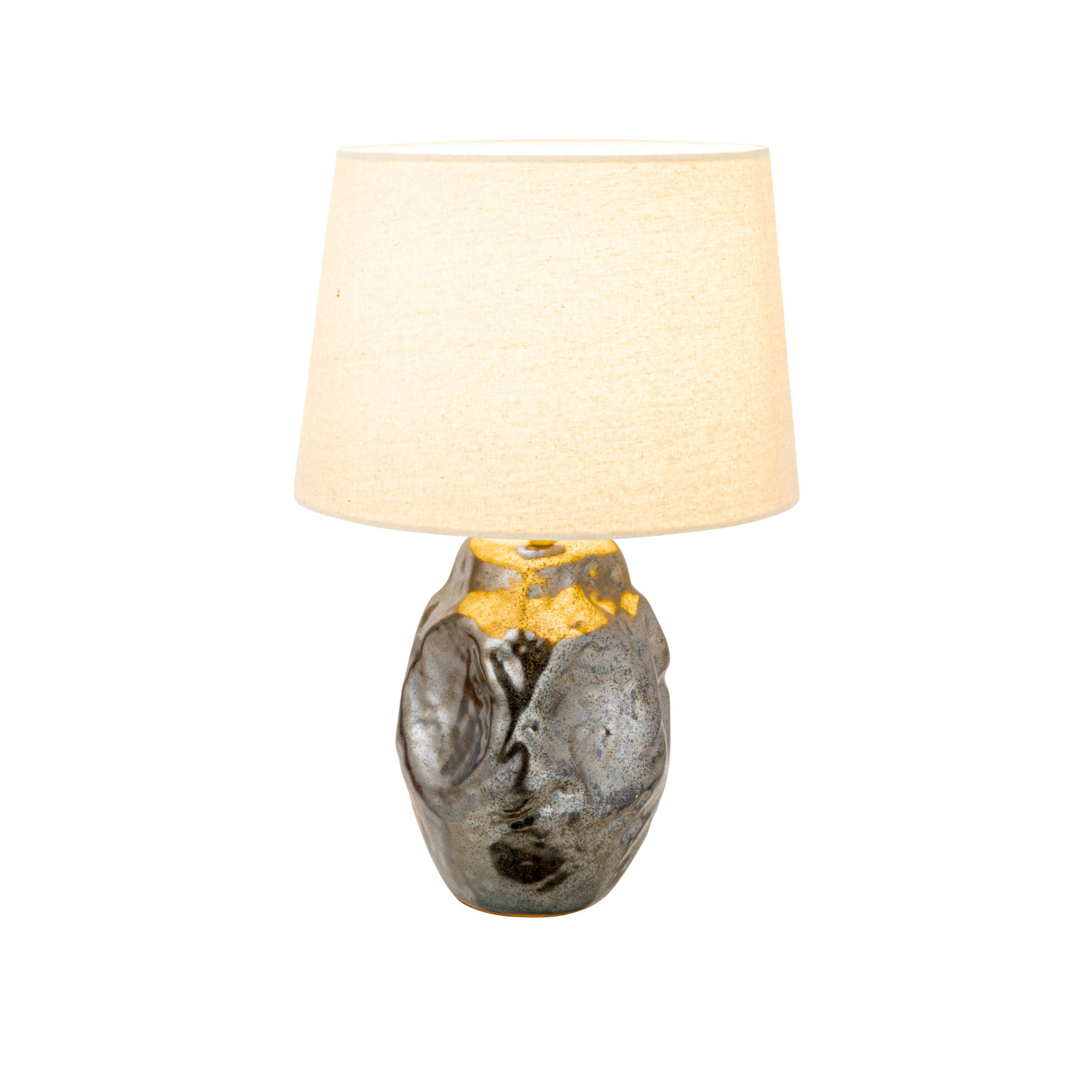 Catalog Name: 13" Round x 20"H Ceramic Organic Shaped Table Lamp w/ Fabric Shade & Inline Switch, Metallic Reactive Glaze, Gunmetal Color (Each One Will Vary)