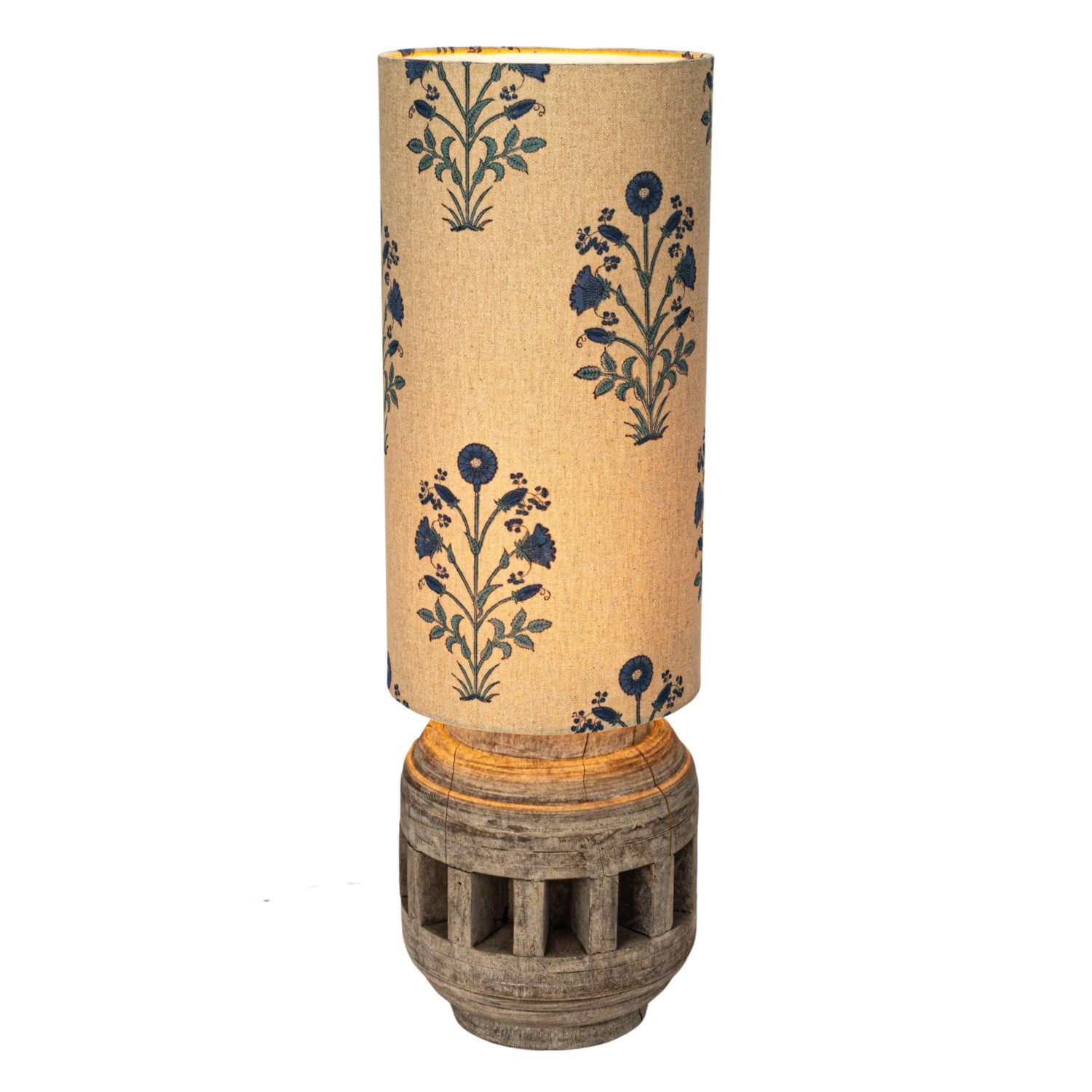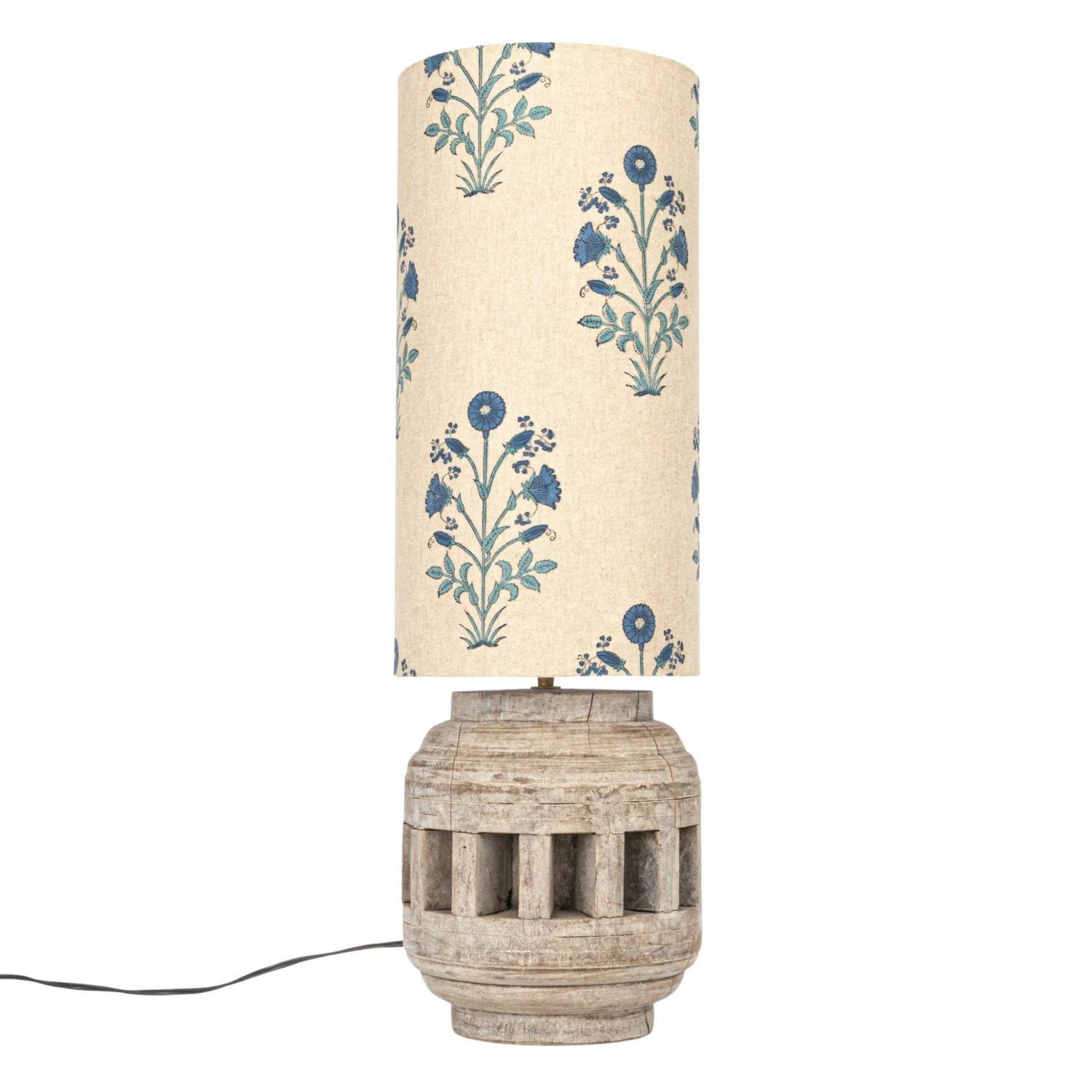 Catalog Name: 10" Round x 31"H Reclaimed Wood Axel Table Lamp w/ Printed Cotton Floral Shade, Swivel Neck & Inline Switch, Natural & Blue (Each One Will Vary)