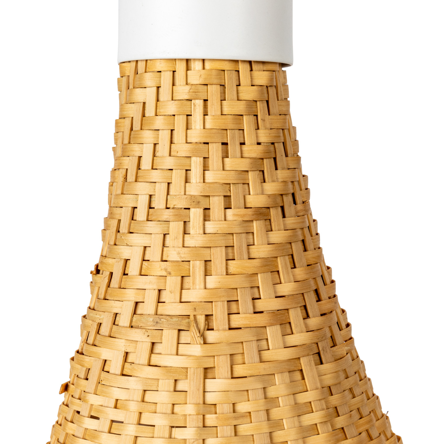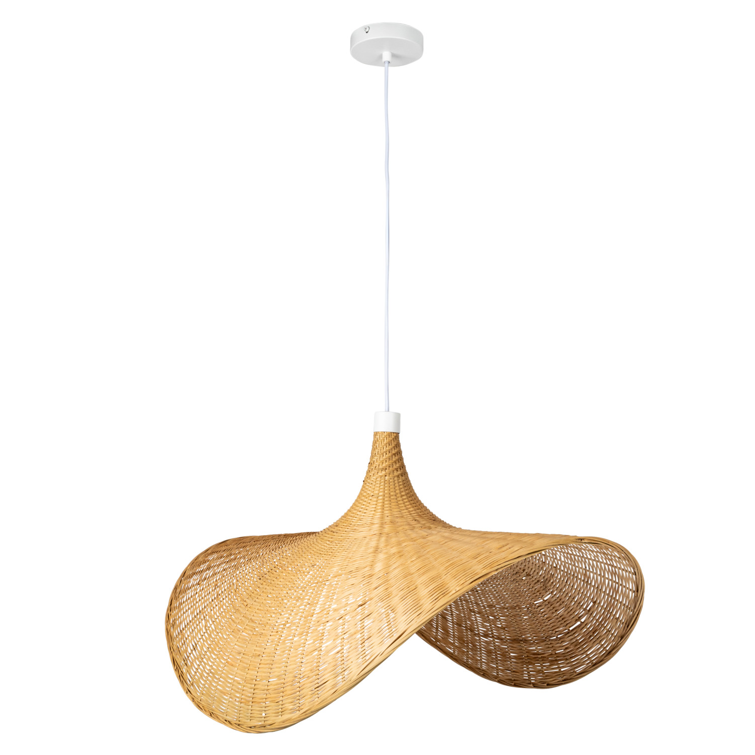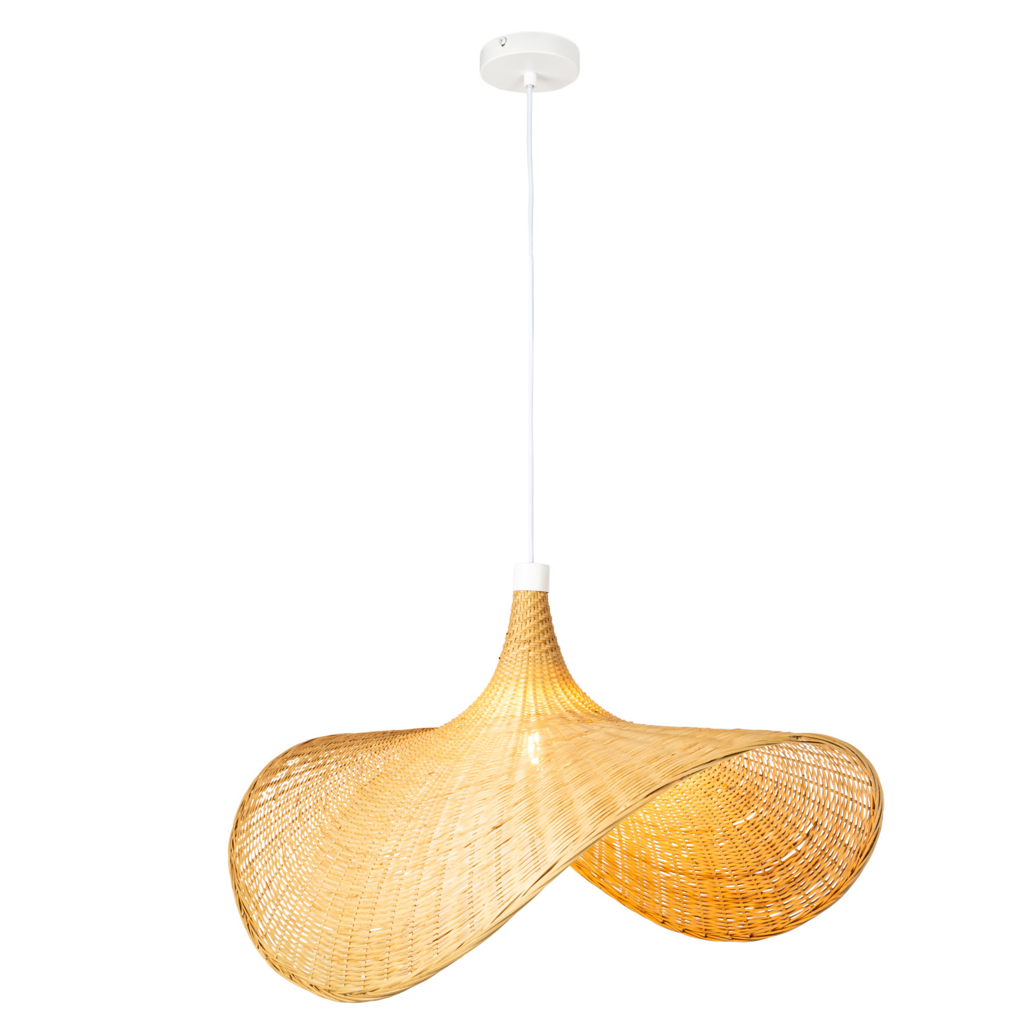 The selection of pendant, flush, chandelier, and ceiling lamps offers style and elegance for any space. The lamps have different shapes, sizes, colors, and materials to match any decor. The lamps create different effects, from focal points to cozy ambiances to dazzling displays for rustic, farmhouse, modern, or contemporary designs. The lamps are easy to install and maintain and provide high-quality lighting for a long time. The collection has modern, minimalist, classic, and ornate lamps for any room. The perfect lighting solution is waiting in the collection of pendants, flush, chandeliers, and ceiling lamps. Don't miss this opportunity to transform every space with these stunning lamps. This natural bamboo pendant lamp features a fan-shaped design that adds a touch of tropical flair to any space. Whether placed in any foyer, dining room, or living area, it will set the mood for welcoming guests. Requires hardwiring and comes with a six-foot cord. 60-watt maximum bulb required (sold separately).