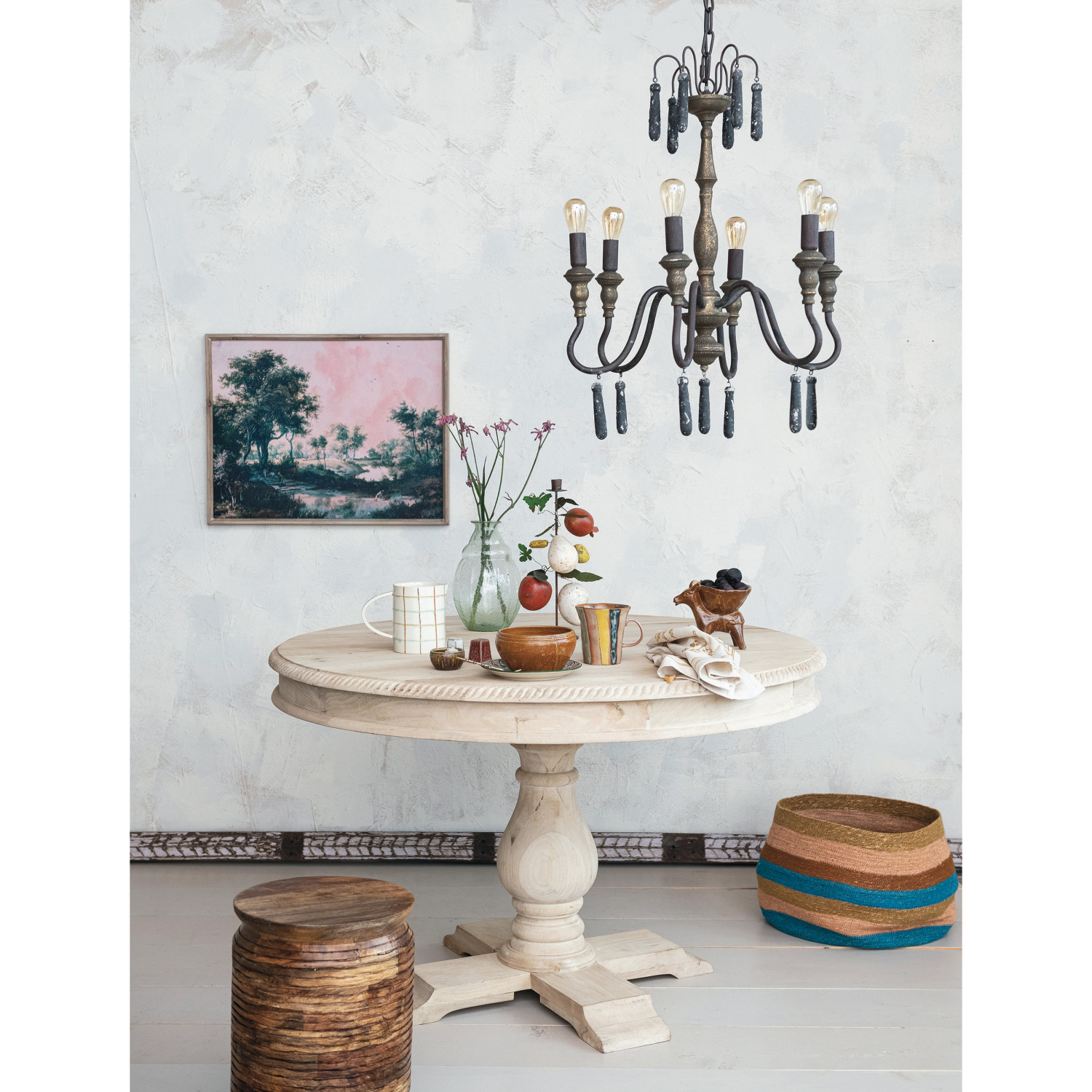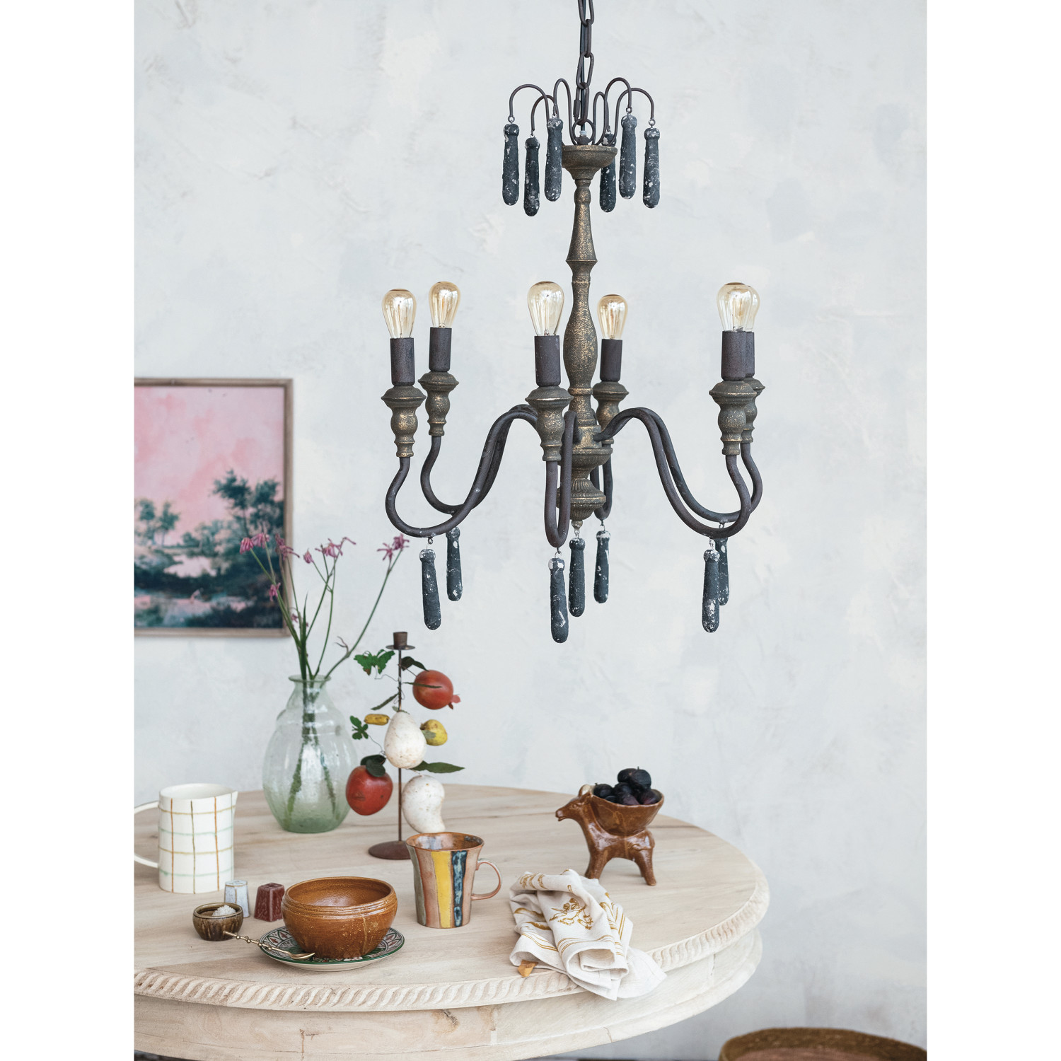 This Metal Pendant Lamp with Wood Drops is a statement piece that captivates with its distressed finish in black and gold colors. The charcoal-colored canopy, measuring 4.75 inches round, complements the lamp's overall aesthetic. It requires 6 E12 bulbs to illuminate any space with a soft, inviting light. The lamp's dimensions, along with a 5.5-foot chain and a 9-foot cord, offer versatility in installation and placement. Whether it's hung in a dining area or a cozy reading nook, this pendant lamp adds a touch of sophistication and a hint of nostalgia to the home decor. The combination of metal and wood elements creates a unique contrast that adds character to any room. The adjustable chain and cord length make it easy to customize the lamp's height to suit every space perfectly.