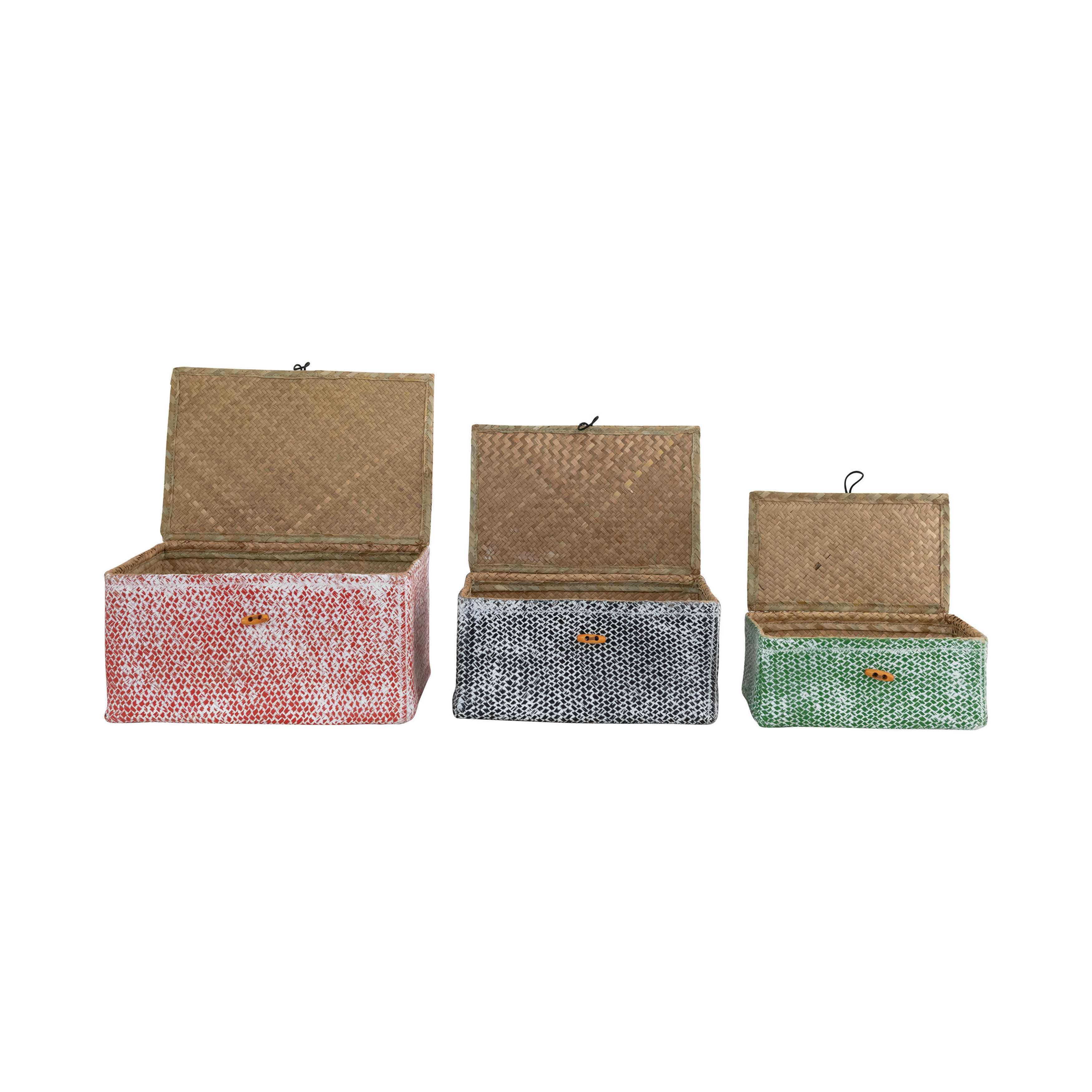 Catalog Name: 14-1/2"L x 9-3/4"W x 7"H, 12-1/2"L x 7-3/4"W x 6"H & 10-1/2"L x 6"W x 4-3/4"H Hand-Woven Palm Leaf Boxes w/ Lids & Toggle Closures, Multi Color, Set of 3