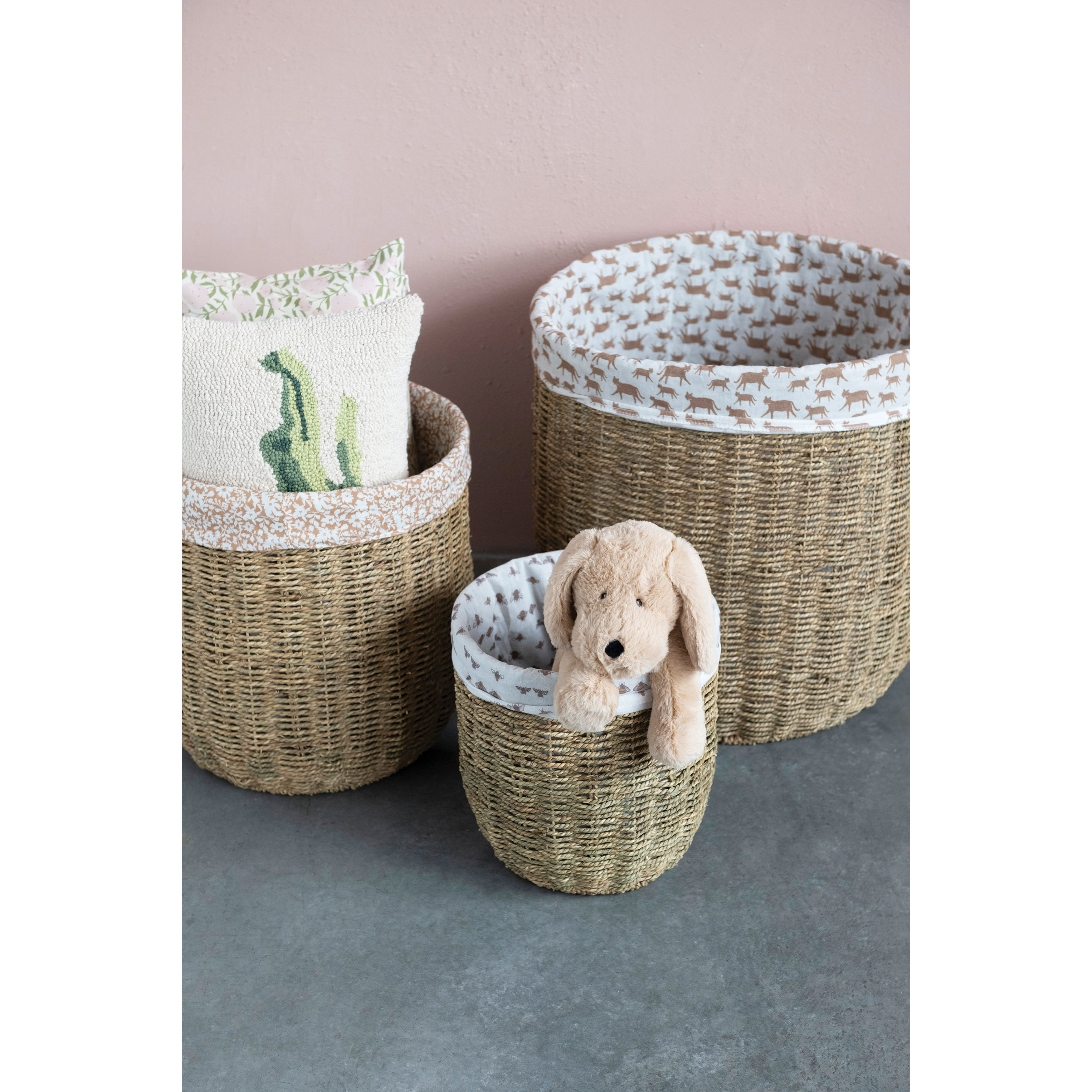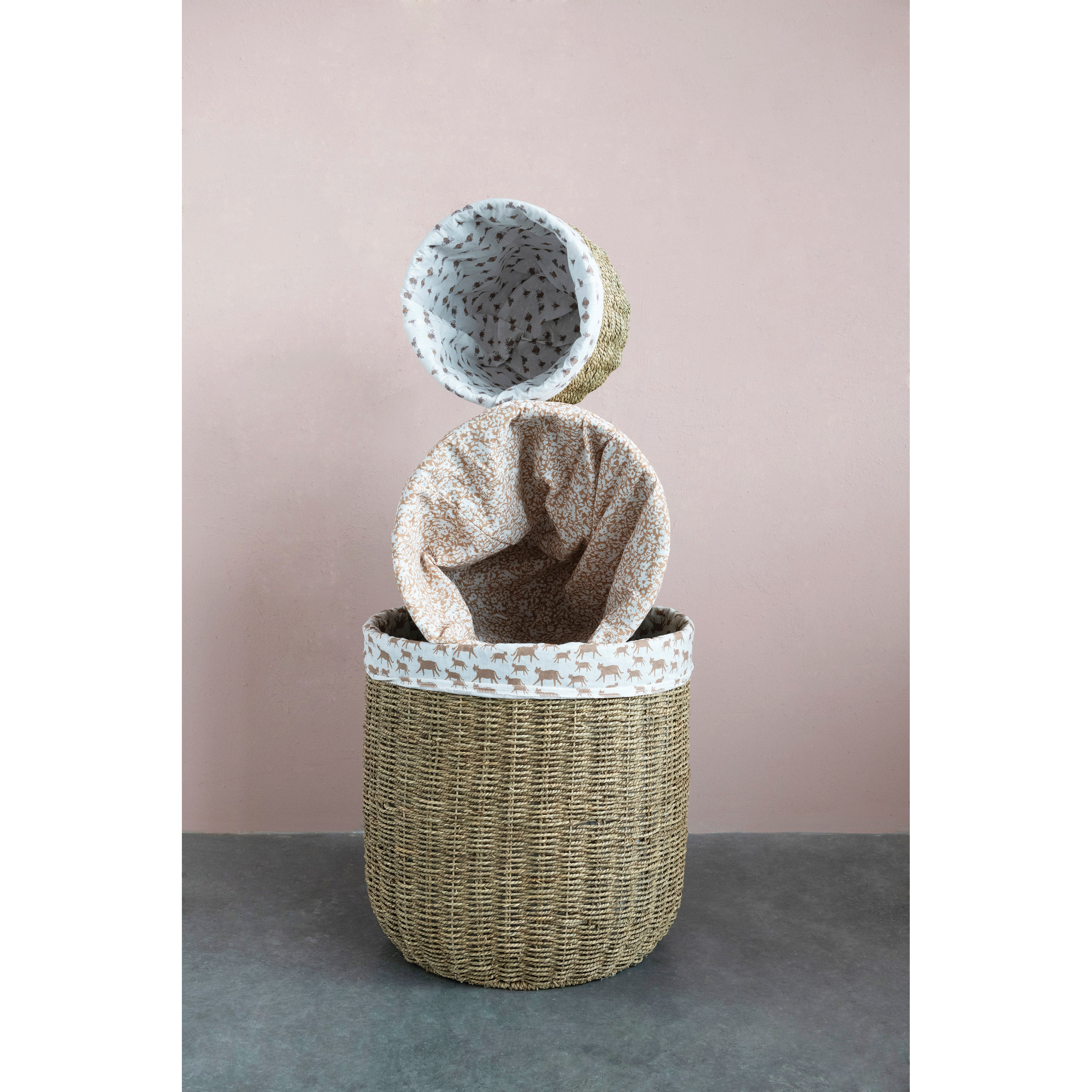 Hand-Woven Grass Laundry Baskets with Patterned Cotton Lining, Set of 3