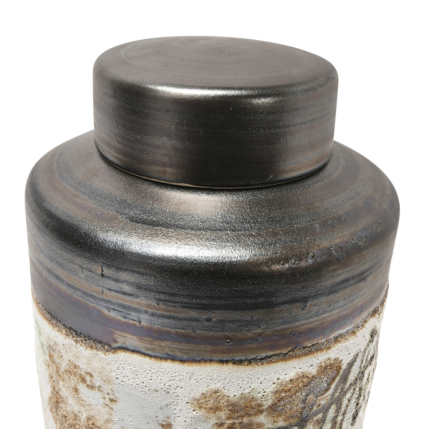 This hand-painted stoneware ginger jar with a lid adds spice to any home. The gorgeous jar features a reactive glaze that creates a unique pattern of colors and textures on the surface. The jar is adorned with hand-painted floral motifs that enhance its charm and appeal. It can be used as a vase for fresh flowers, a cookie jar for delicious treats, or a decorative accent on a shelf or mantel. The jar brings warmth and style to any room. It is made of durable stoneware with a glossy finish and a matching lid that fits snugly on top. It measures 8.5 inches round and 13.5 inches in height and is easy to clean with a damp cloth. This hand-painted stoneware ginger jar with a lid is a must-have for anyone who loves art and beauty. Order this today and enjoy a stylish and practical addition to any home. A stunning piece of art that showcases the beauty of reactive glaze and hand-painted details. Perfect for adding a touch of color and elegance to any traditional or eclectic home décor. A versatile jar that can be used as a vase, a cookie jar, or a decorative accent on a shelf or mantel. Made of durable stoneware with a glossy finish and a matching lid.