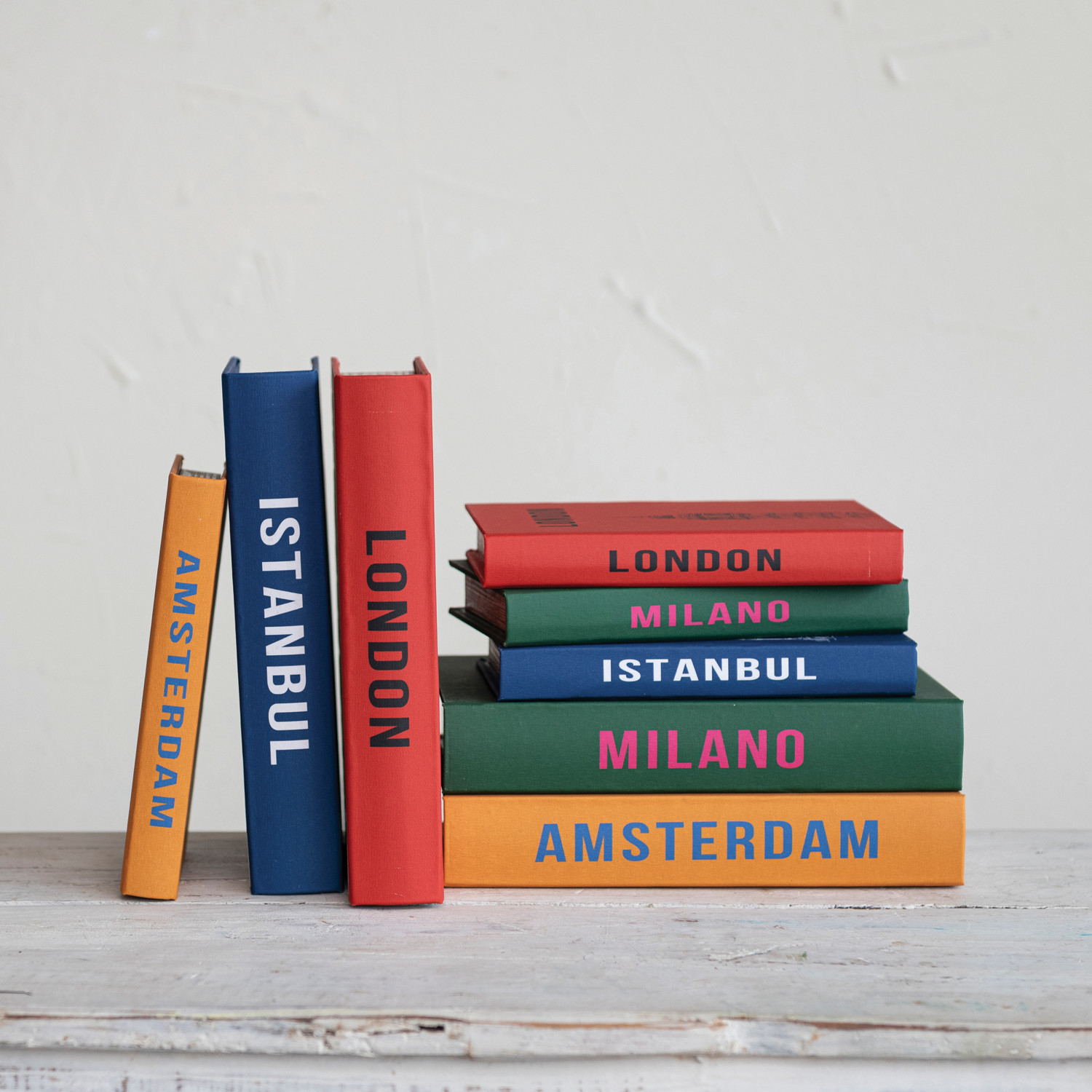Catalog Name: 10-1/4"L x 6-3/4"W MDF & Canvas Book Storage Boxes w/ City Name, Multi Color, Set of 2, 4 Styles