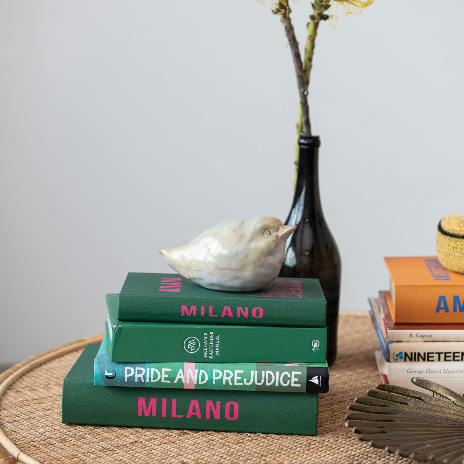 Curate an elegant, storied space with our thoughtfully crafted collection of decorative boxes, bins, and baskets, designed to transform clutter. Peruse a vast selection of unique, display-worthy pieces created to stylishly streamline a space of any design scheme, including woven baskets, hanging baskets, trays, display boxes, jewelry boxes, trunks, lidded containers, and so much more. Choose from a wide array of materials from reclaimed wood and paper mache to genuine horn and ceramic, and styles from mid-century modern and coastal to classic farmhouse and cottage. Elegantly stow unsightly odds and ends, or display treasured trinkets with decorative storage that is sure to impress. This farmhouse-inspired set of canvas storage boxes showcases the silhouette of a book with destination illustrations on the covers. Display in a living space of any style from cottage to farmhouse. Add a touch of personal style to a mantelpiece of shelfscape with this set of decorative book storage boxes. Made from MDF and canvas.