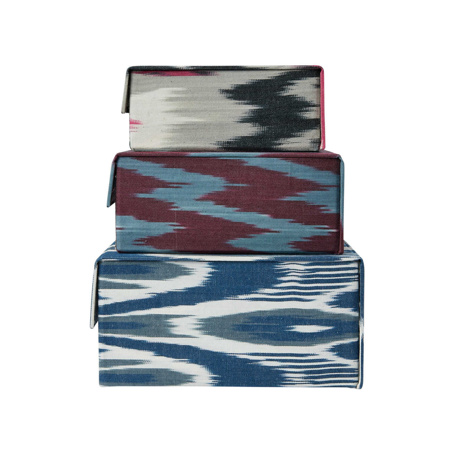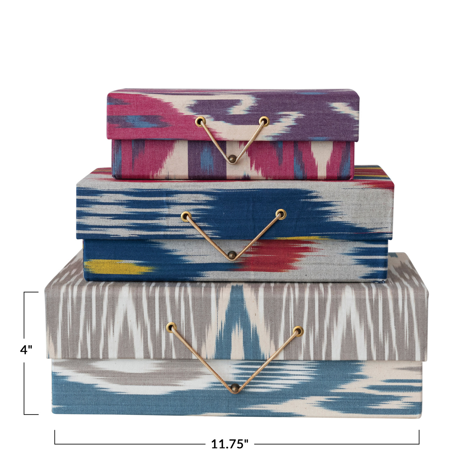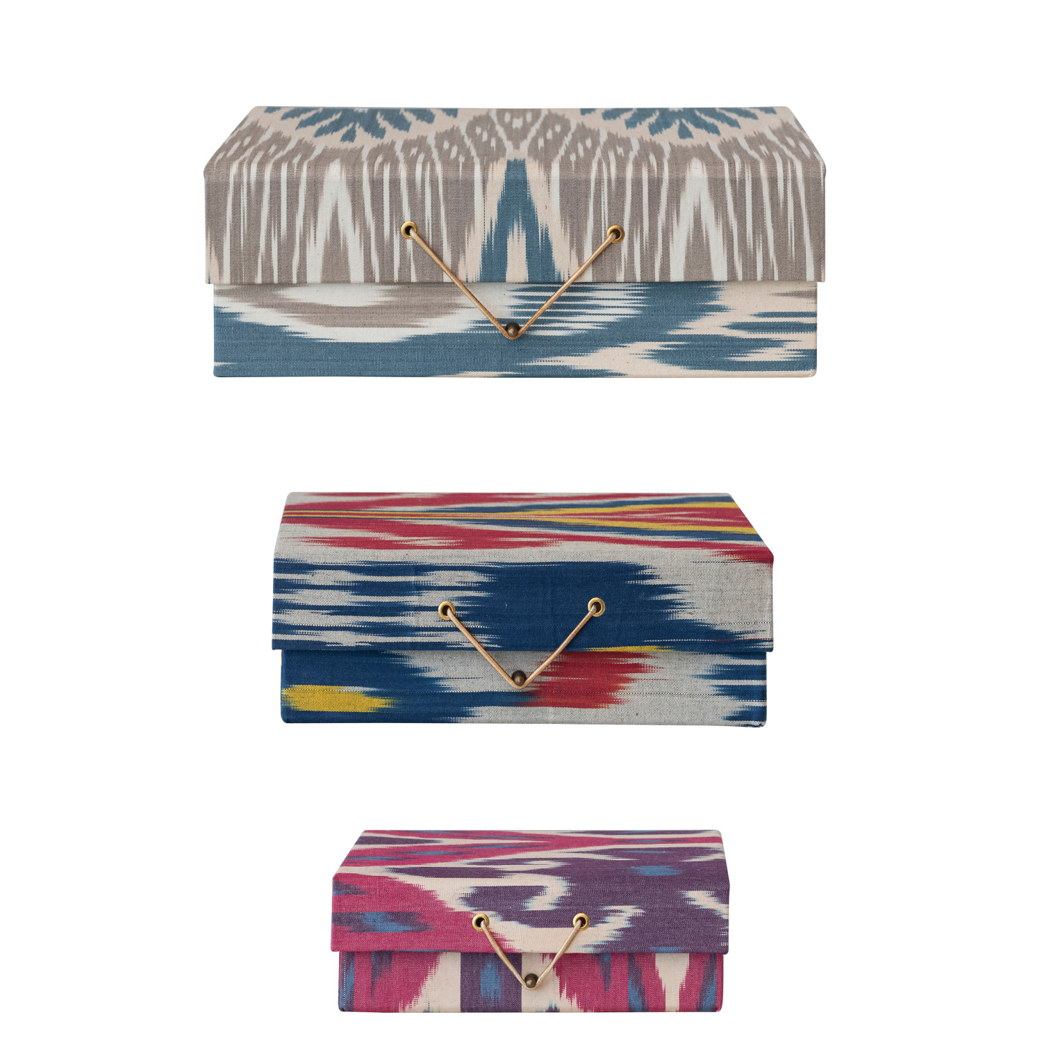 Catalog Name: 11-3/4"L x 8"W x 4"H, 10-1/4"L x 7-1/2"W x 3-1/4"H & 8-1/4"L x 6-1/4"W x 2-3/4"H Found Cotton Boxes w/ Lids, Ikat & Closures, Multi Color, Set of 3 (Each One Will Vary)