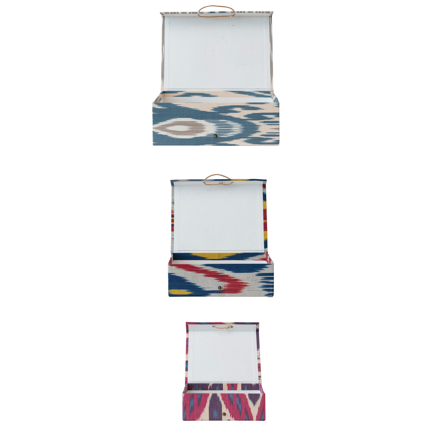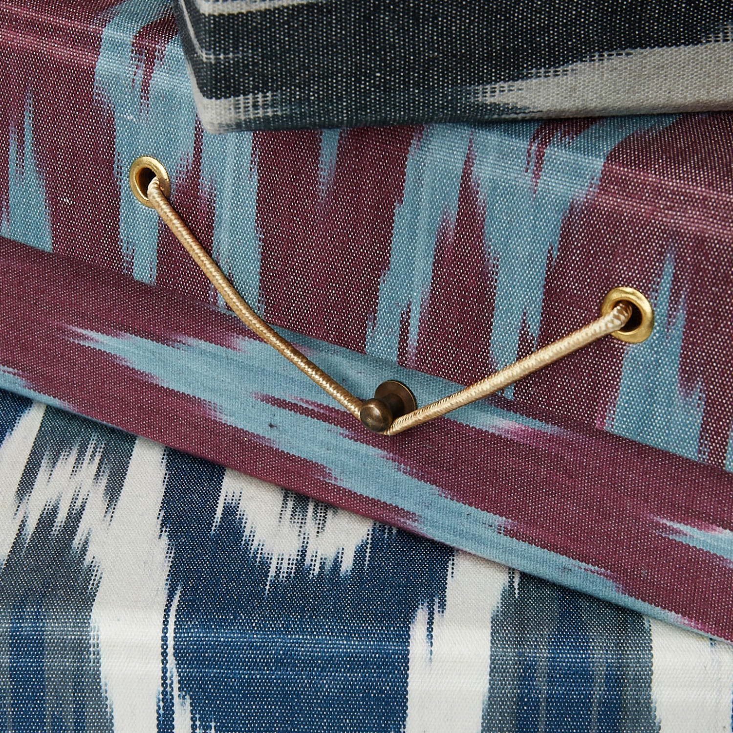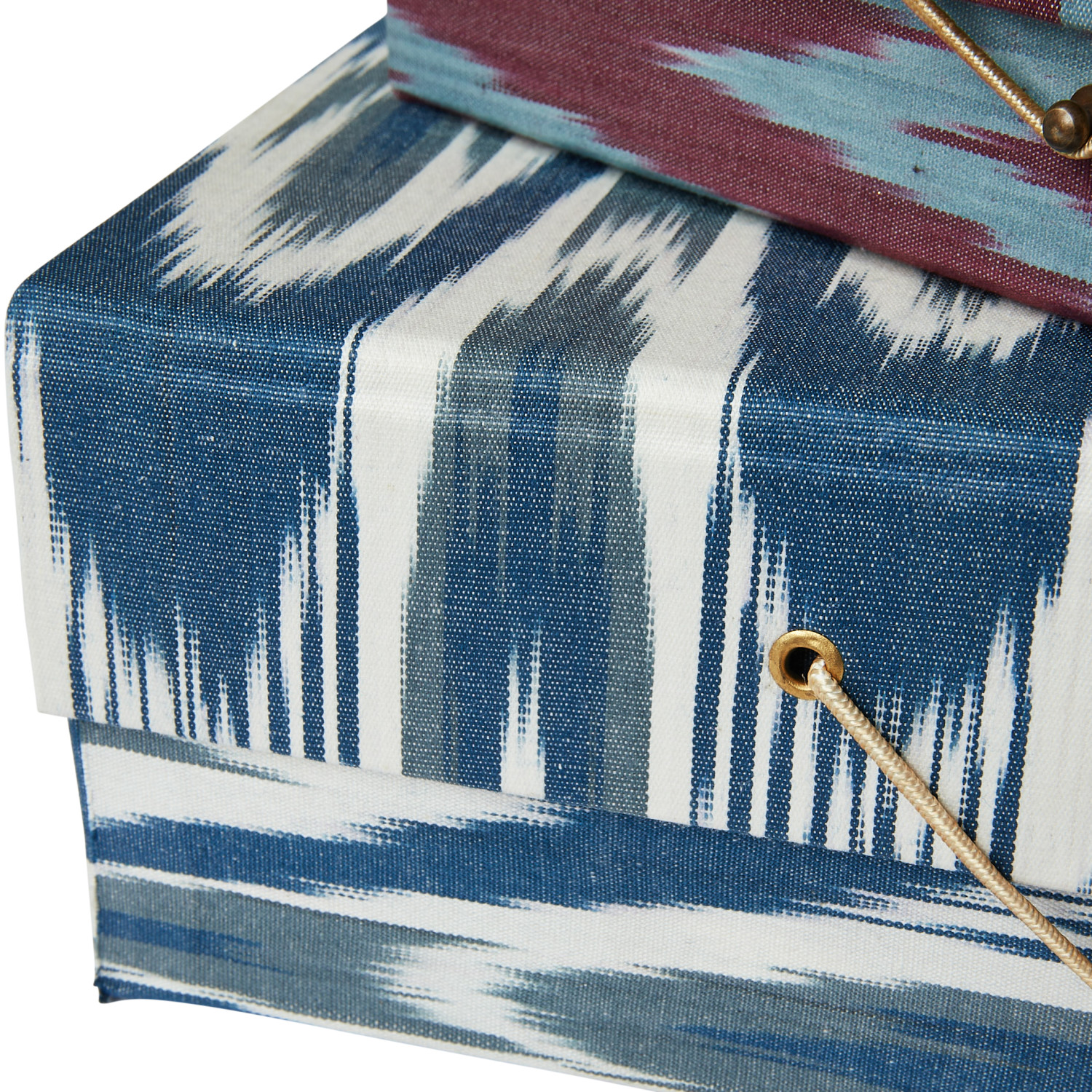 Catalog Name: 11-3/4"L x 8"W x 4"H, 10-1/4"L x 7-1/2"W x 3-1/4"H & 8-1/4"L x 6-1/4"W x 2-3/4"H Found Cotton Boxes w/ Lids, Ikat & Closures, Multi Color, Set of 3 (Each One Will Vary)